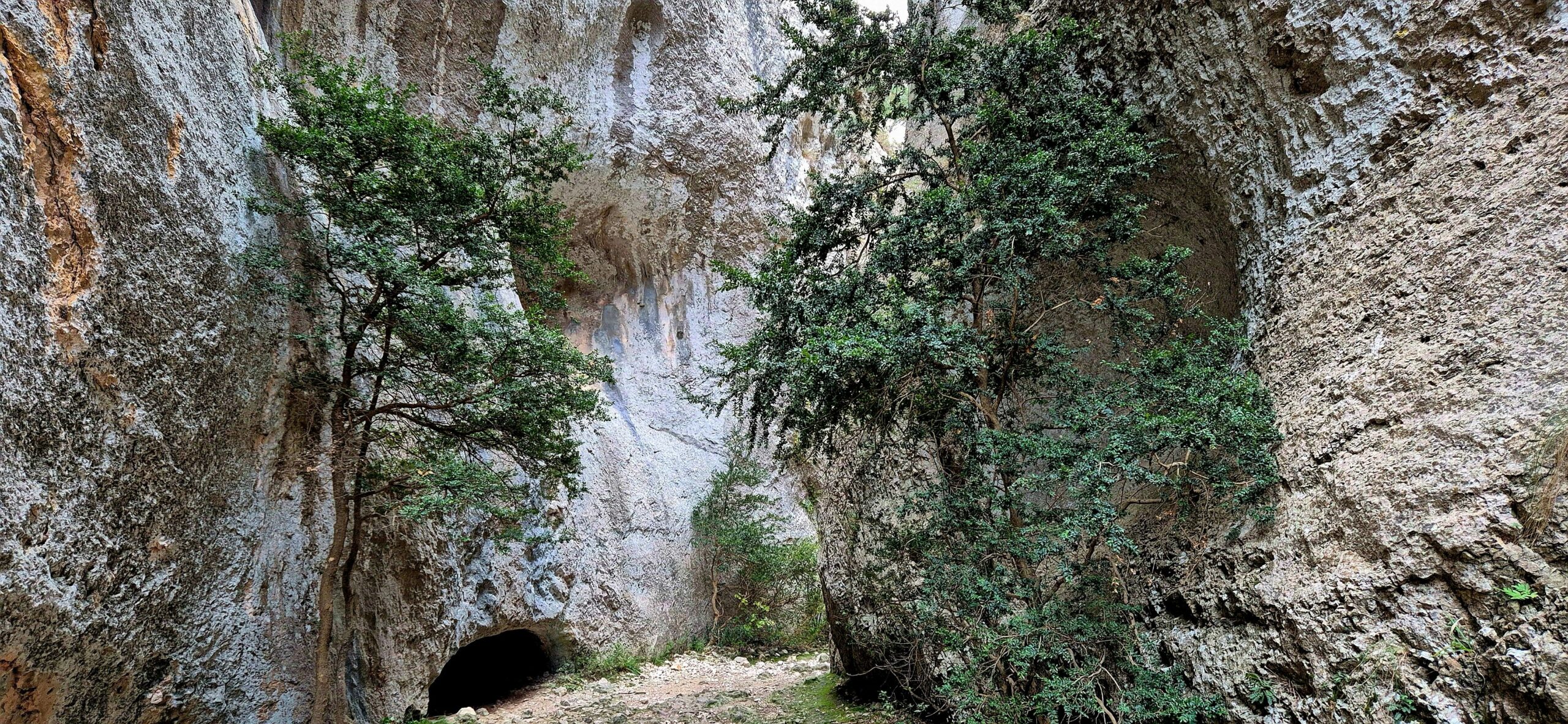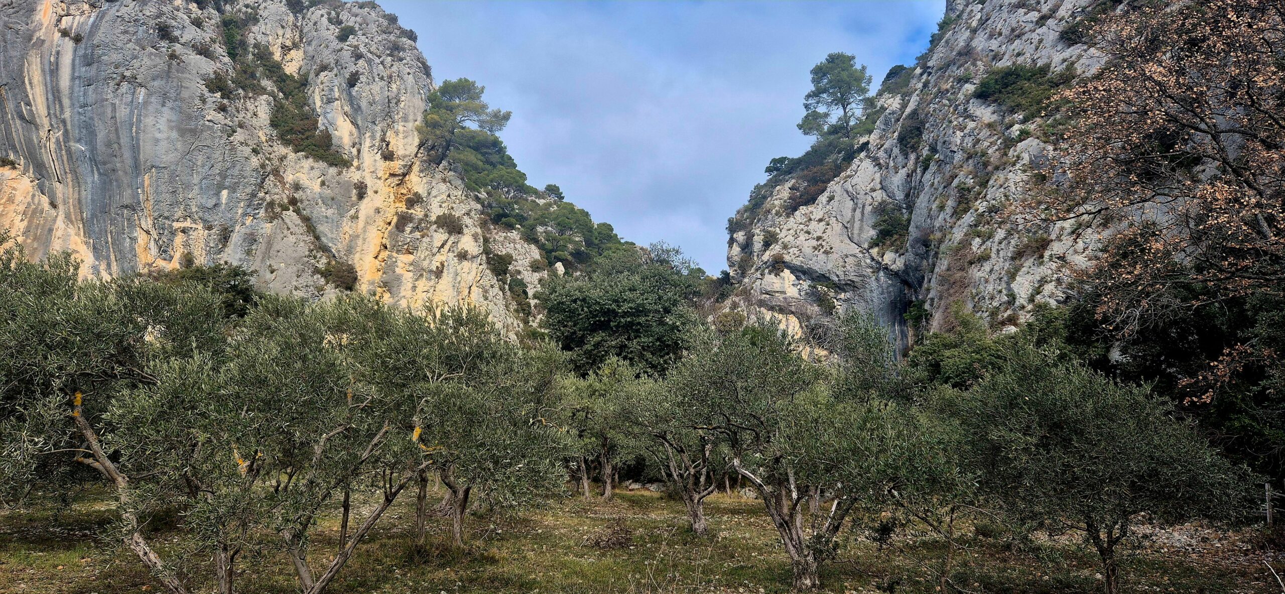 On s’engage dans la gorge de Regalon après un bref parcours dans une oliveraie, cernée par les falaises (photo 1). Les falaises sont relatiement éloignées les unes des autres dans la première partie du parcours, permettant à une végétation relativement abondante de se développer sur les parois et à leur base (photo 2). Sur les parois, les plantes (pin sylvestre, buis et autres) poussent surtout sur les replats et fissures où se concentre un peu de sol et de l’humidité. Les lianes sont abondantes et nombreuses : on y voit du lierre (Hedera helix), des ronces (Rubus ulmifolius) et de la salsepareille (Smilax aspera).