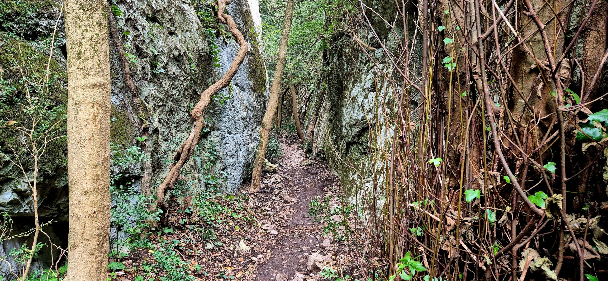 Lorsque les parois sont très rapprochées, les plantes disparaissent par manque de lumière et de substrat. Le passage est alors difficile ! Des rochers tombés de la falaise témoignent d’une érosion toujours active.