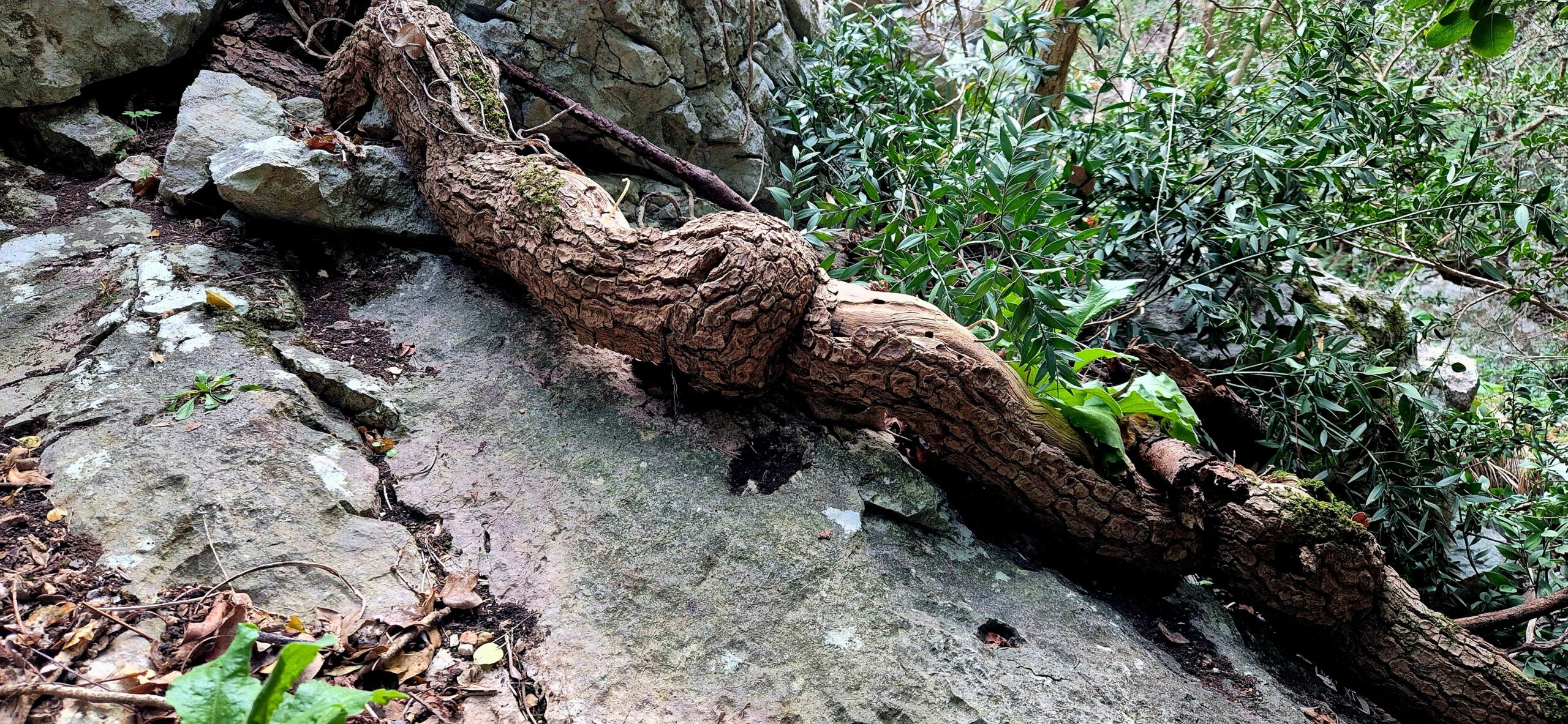 Ce canyon comprend dans une partie un peu discrète du parcours, un énorme lierre, dont le diamètre du tronc est de 45 cm en moyenne. Son écorce, très crevassée, rend cette mesure incertaine, mais cet individu est sans doute un des plus gros d’Europe. Il semble en mauvais état avec de nombreux axes pourris et un feuillage globalement réduit. Ce lierre est bien connu des gestionnaires ONF et des scientifiques du parc naturel régional du Lubéron, pour son caractère exceptionnel. Il va d’ailleurs figurer dans le livre des records des lianes tempérées d’Europe, dans un article prochain d’un des spécialistes américaines de l’écologie des lianes, Stefan Schnitzer (un homonyme !).