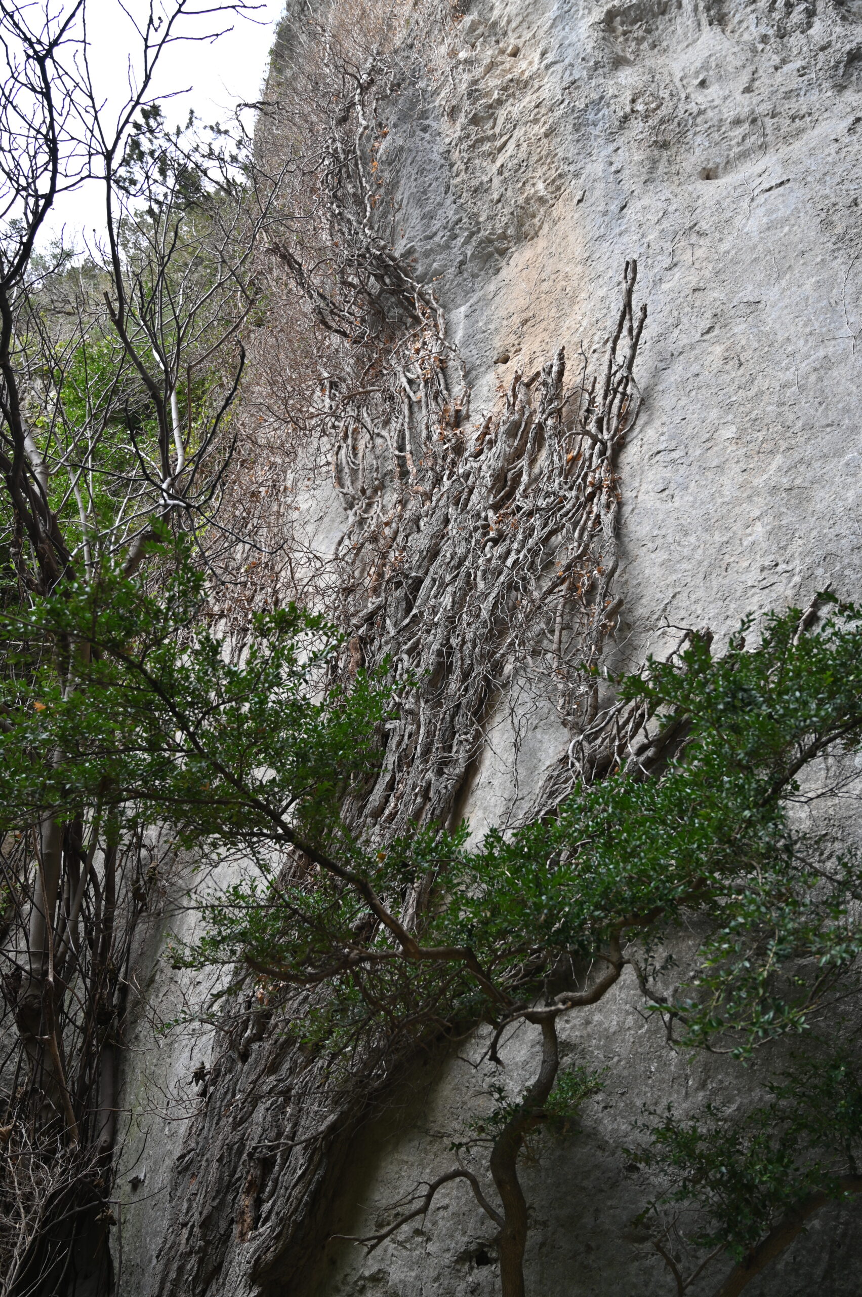 Ci-dessous : les plantes comme le buis utilisent les fissures des parois pour s’ancrer et développent des architectures tortueuses liées aux difficultés de croissance dans ce milieu rocheux .