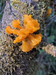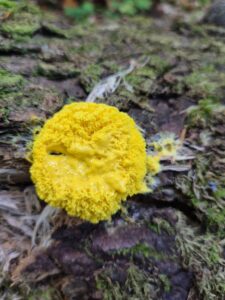 Ci-dessous : les champignons vivant sur les arbres morts (photos et 3) flamboient à l’automne. Au centre, un magnifique myxomycète jaune vif.