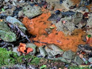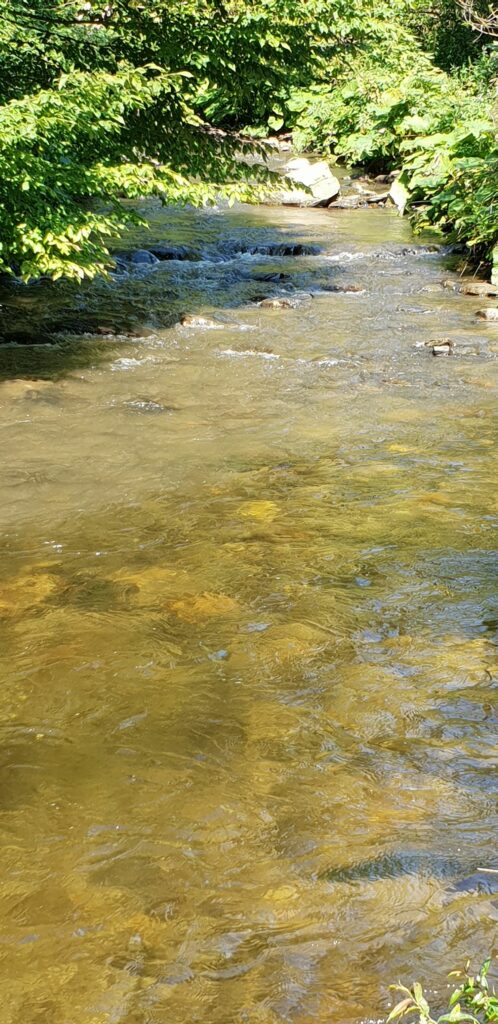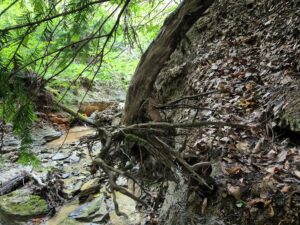 Photo ci-dessous :très en aval de la forêt, on y voit deux parties d’un même ruisseau se rejoignant ici à une petite confluence. Le ruisseau à droite à eaux claires provient de la forêt dense, celui plus en arrière à eaux troubles d’un ruisseau qui a traversé une coupe forestière. Les sols ne sont plus protégés par l’architecture dense de la forêt et ruissellent dans les vallées.