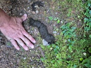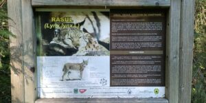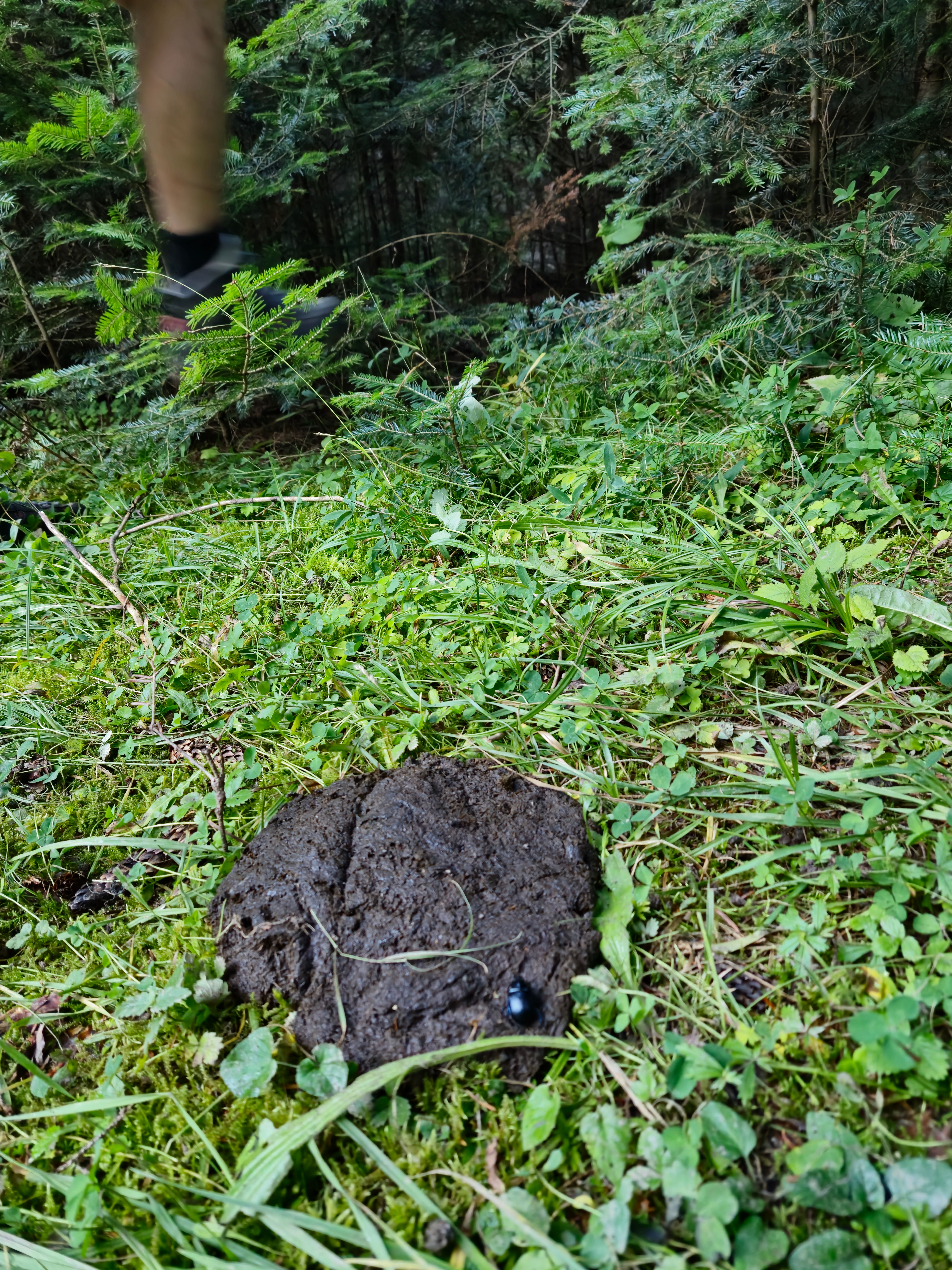 Ci-dessous : photo 1 : crotte d’ours le long d’un de ses sentiers. Photo 2: crotte de loup (ou de lynx ?) fraîche. Photo 3: signalisation de la présence de lynx. Les cerfs sont également bien présents, de même que les sangliers et les chevreuils.