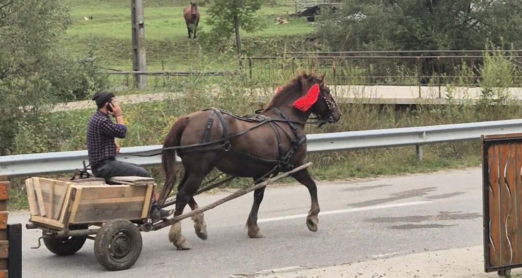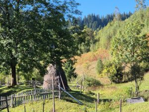 En route vers la modernité, particulièrement avancée dans les grandes villes, la Roumanie a cependant gardé quelques unes de leurs traditions dans ses villages, comme ici à Slatioara, avec des formes typiques des meules de foin, des maisons en bois.