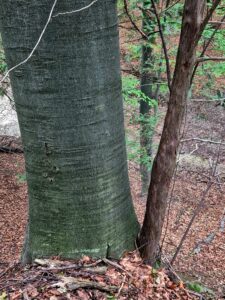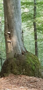 D’autres arbres peuvent être morts de maladie. Mais dans ce cas, la mort est très lente, et touche les arbres âgés. Ci-dessous : photo 1 un hêtre de la canopée atteint d’une maladie qui lui fait grossir la base du tronc. Il est dévoré par les champignons, mais encore vivant. Photo 2: le seul orme connu de la réserve. IL est mort à 400 ans.