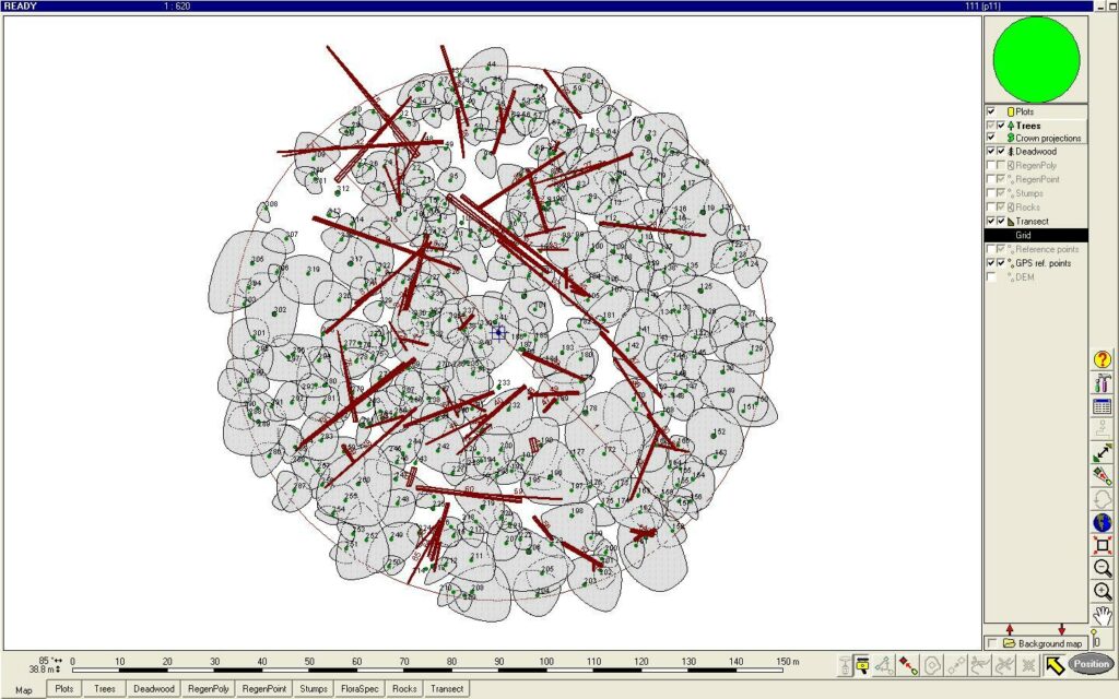 Cette forêt a fait l’objet de recherches nombreuses et variées notamment sur l’architecture forestière. Ci-dessous, ce graphique indique les surfaces couvertes par les couronnes des hêtres (les ronds) et les arbres tombés au sol, démontrant d’une part une canopée dense et continue et l’importance de la mortalité. Source Daniel Turcu