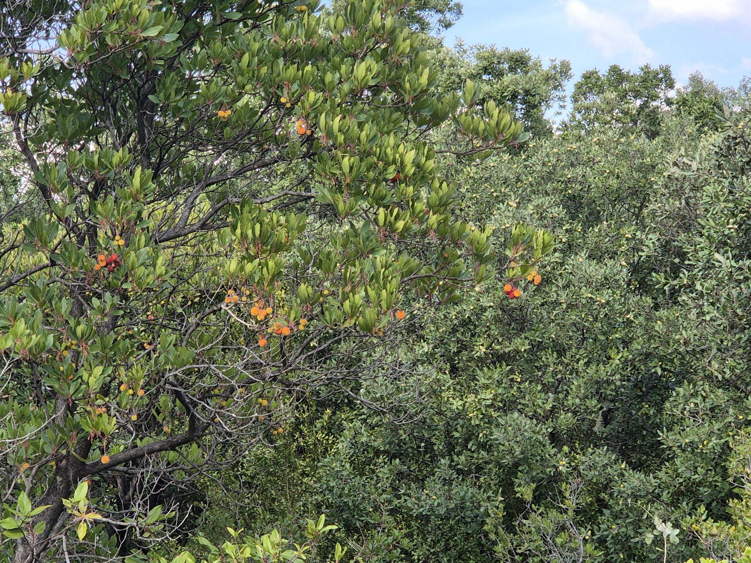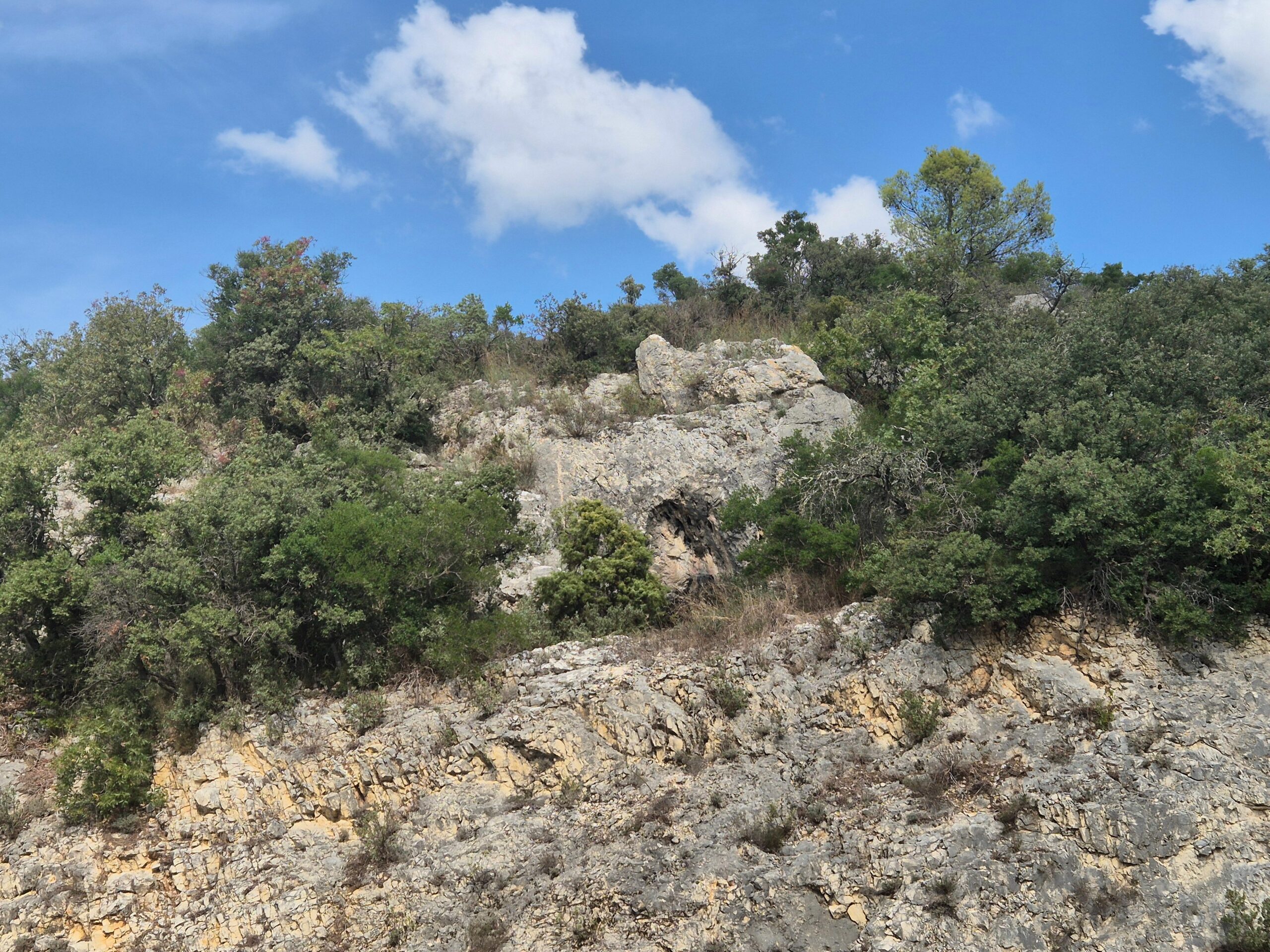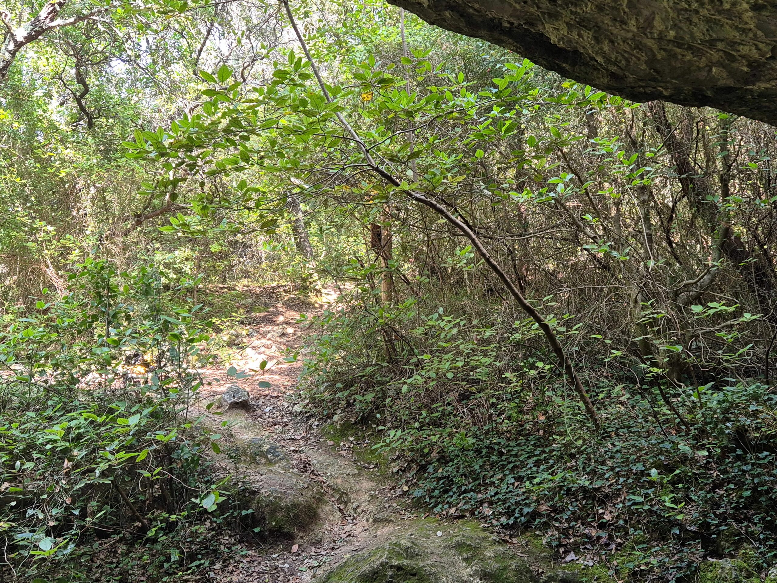 On y accède par un joli petit sentier qui serpente dans la garrigue, constituée par du chêne vert, de l’arbousier (en fruit en septembre), de l’érable de Montpellier, du pistachier et des lianes (salsepareille, clématite).