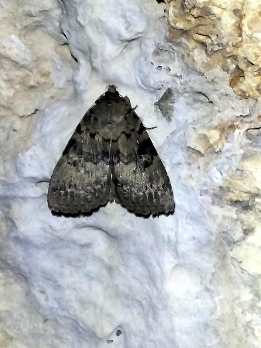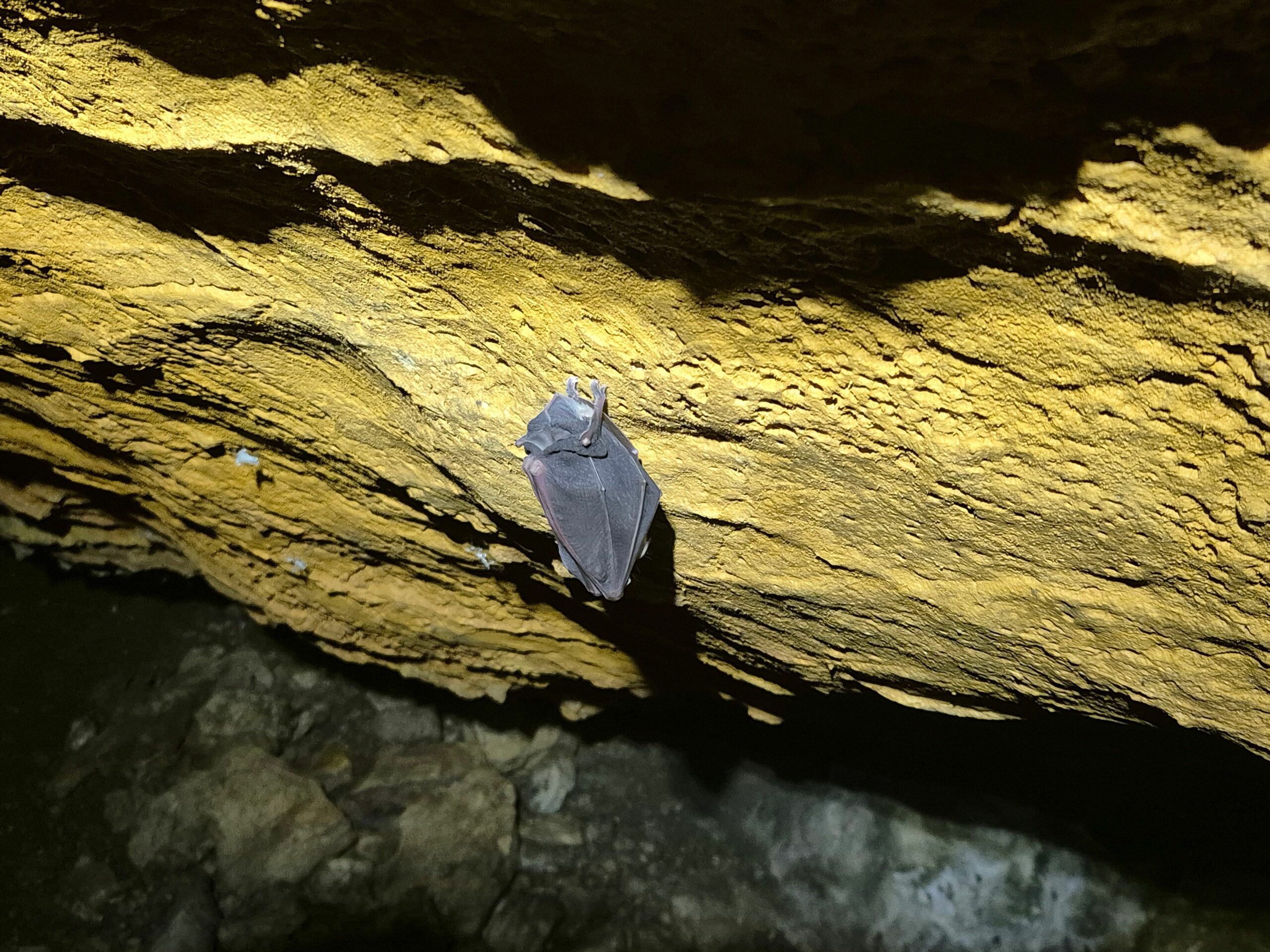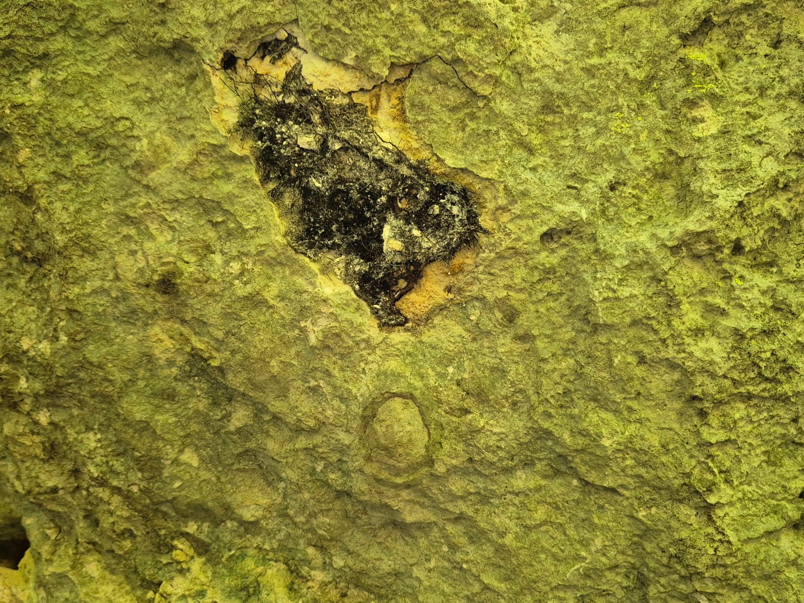 La grotte n° 3 est la plus proche de la route. Cette grotte a livré des indices d’une présence humaine depuis le Néolithique. Les camisards s’en servaient comme abri relai, en se cachant dans les forêts sous le mont Bouquet. Le plafond est d’une jolie couleur jaune, due à des écoulements de matière organique à partir de la surface. Une chauve-souris s’y accroche, de même qu’un papillon Meganola strigula. Photo 3: aspect intérieur de la grotte