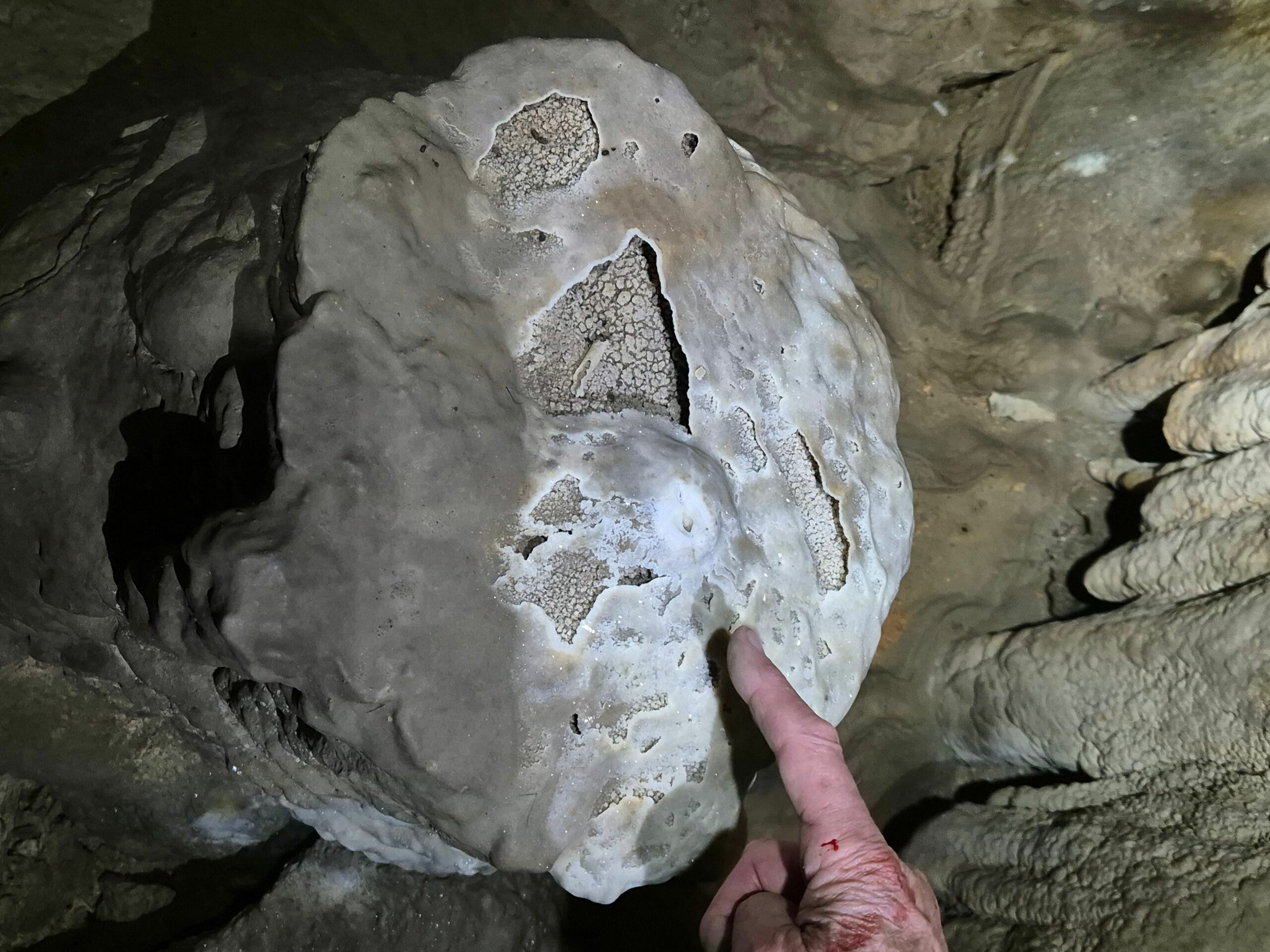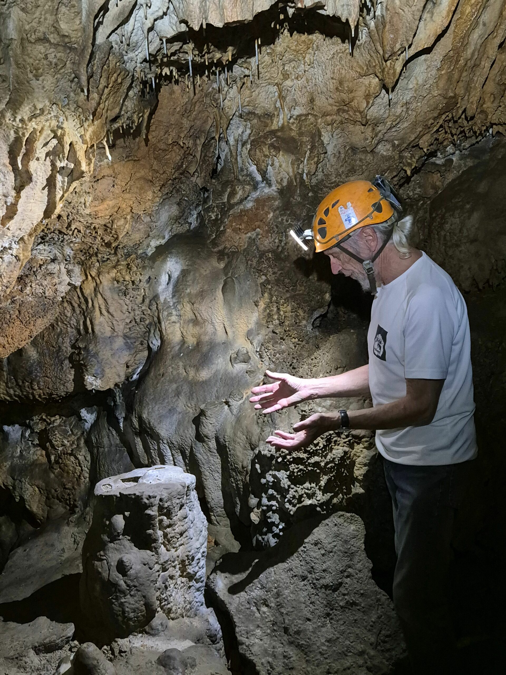 Au sol, se trouvent plusieurs stalactites coupées, tronçonnées à plat, pour poser un vase qui récolte l’eau goutte à goutte. Un moyen d’obtenir de l’eau en période estivale ! Sur ces photos, Michel Wienin montre la stalactite coupée en expliquant le procédé. Il remarque un début de nouvelle stalactite sur ce tronçon depuis qu’il n’est plus utilisé.