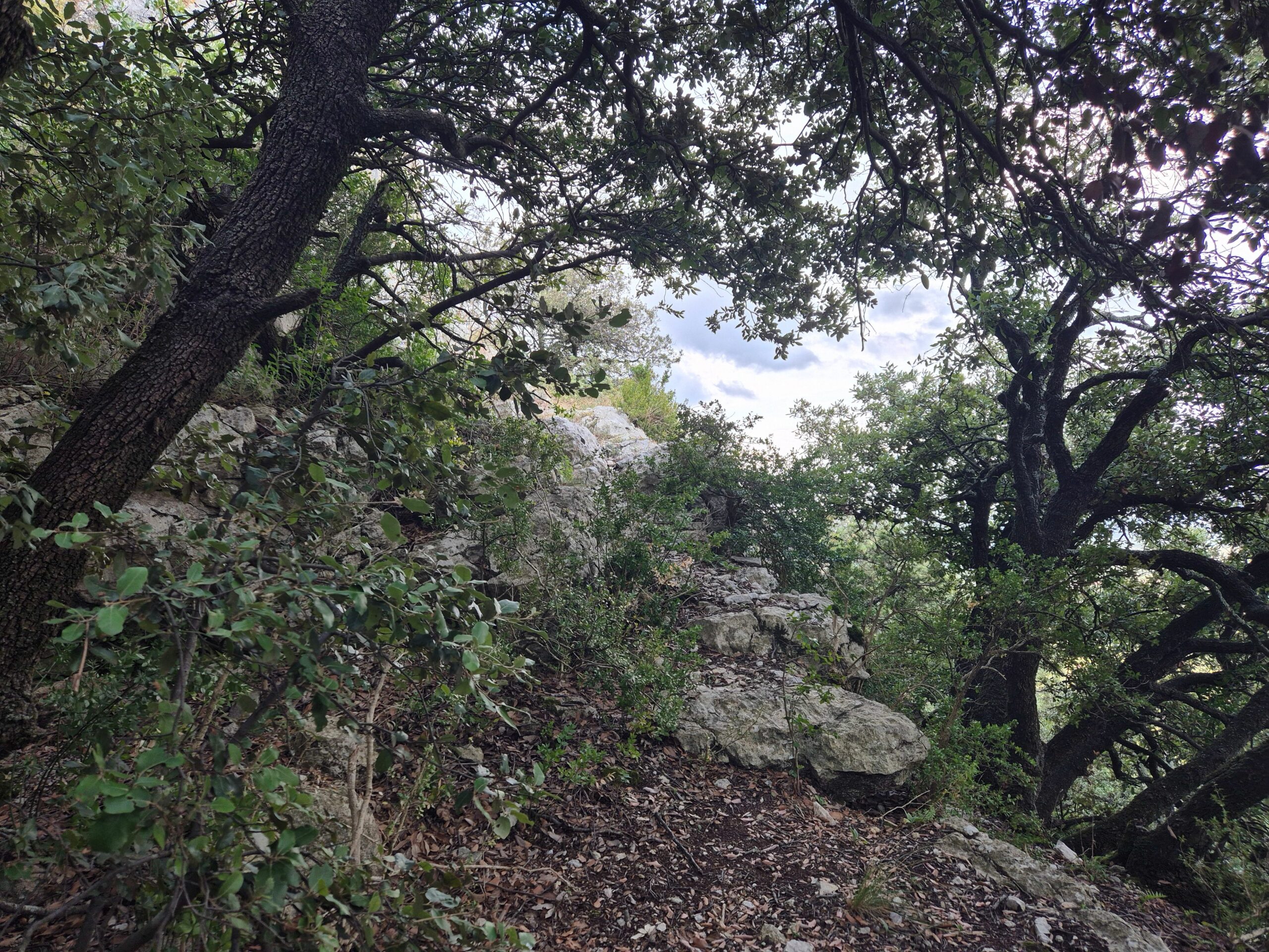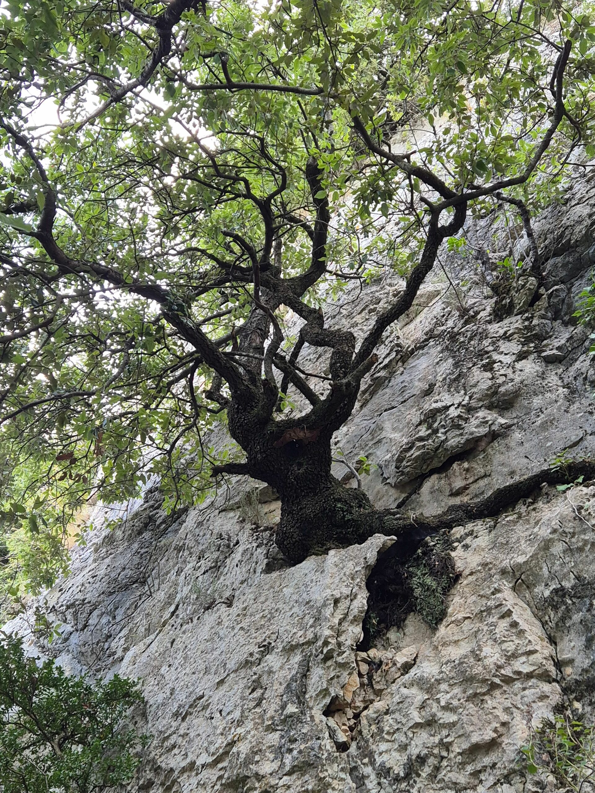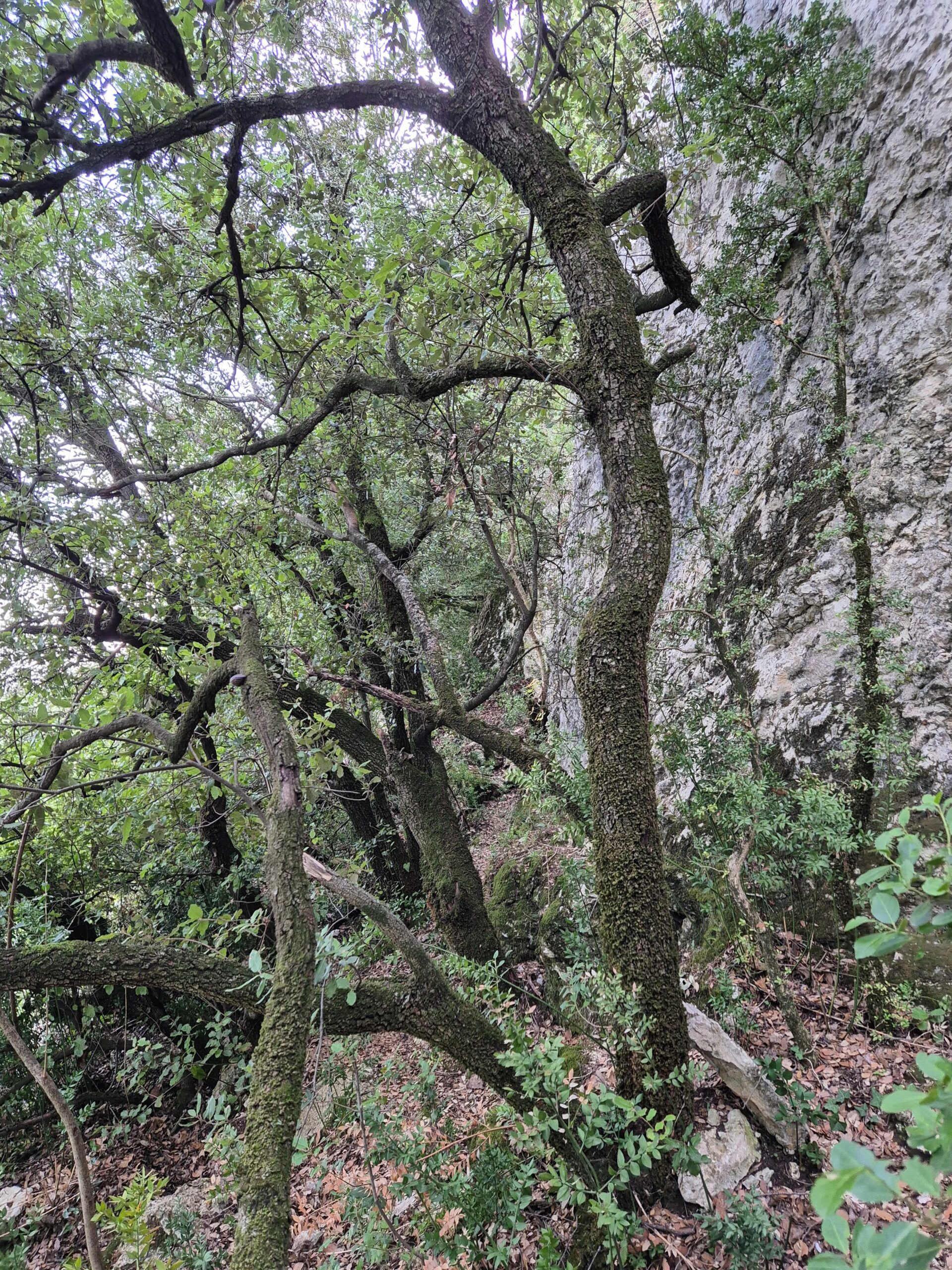 Arrivés à mi pente, on traverse la forêt de chênes verts accrochée aux falaises. Certains ont conservé les éboulis dans leurs racines, d’autres se sont glissés dans les fissures ou rampent au sol.