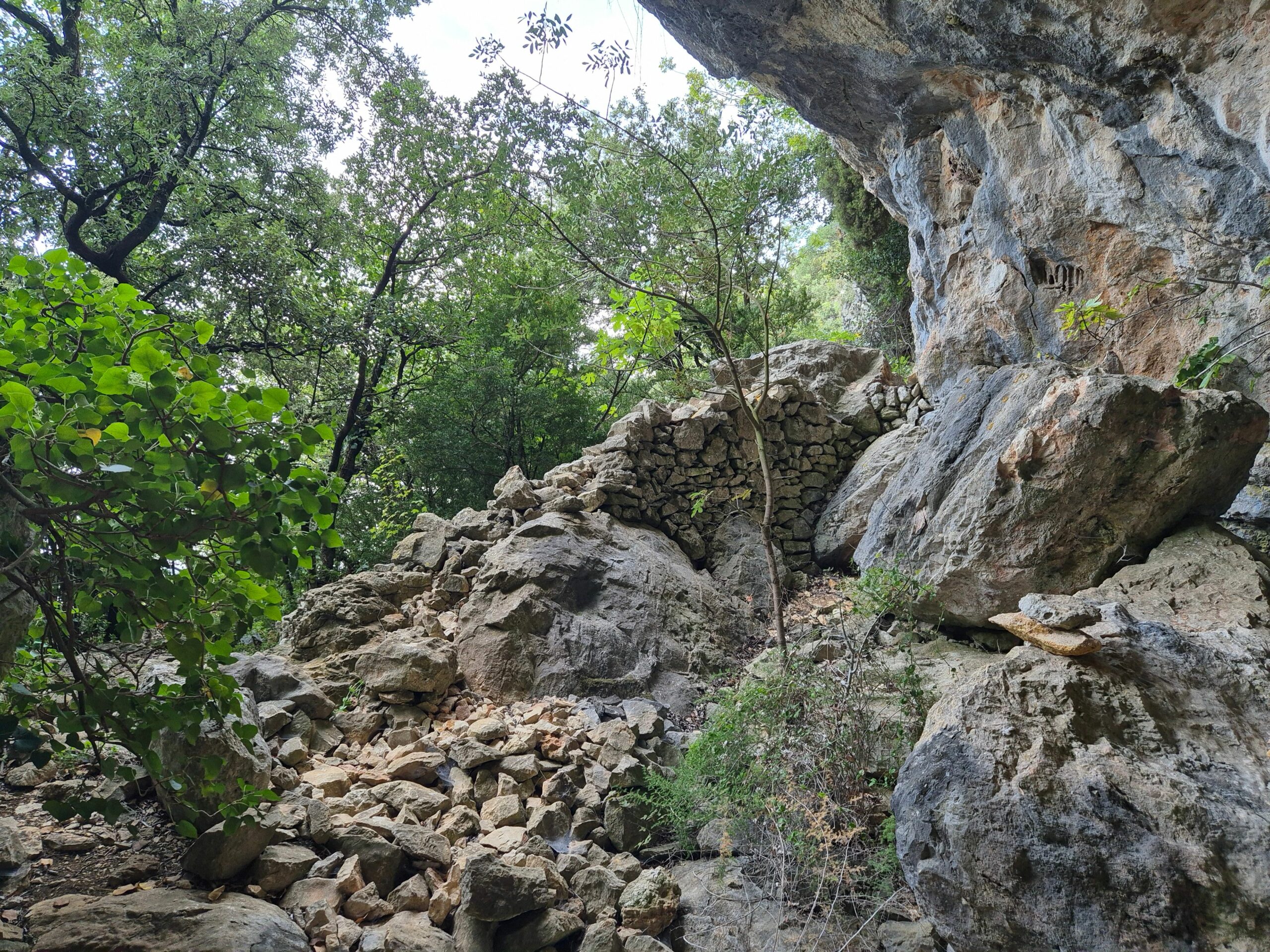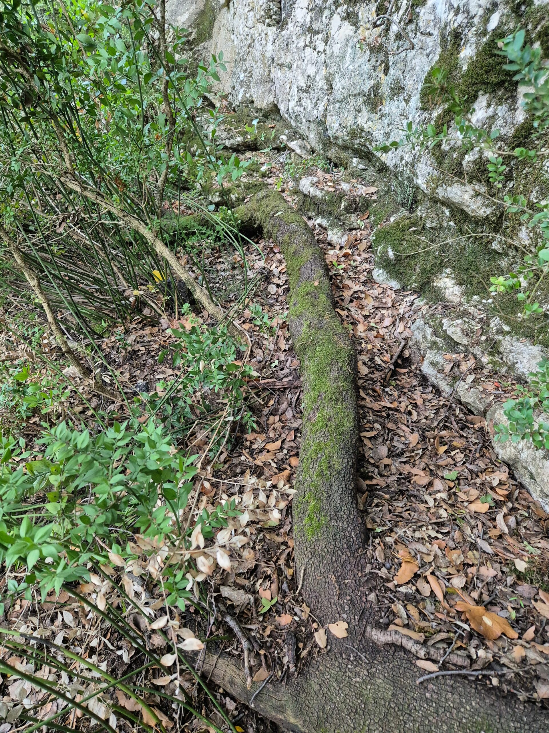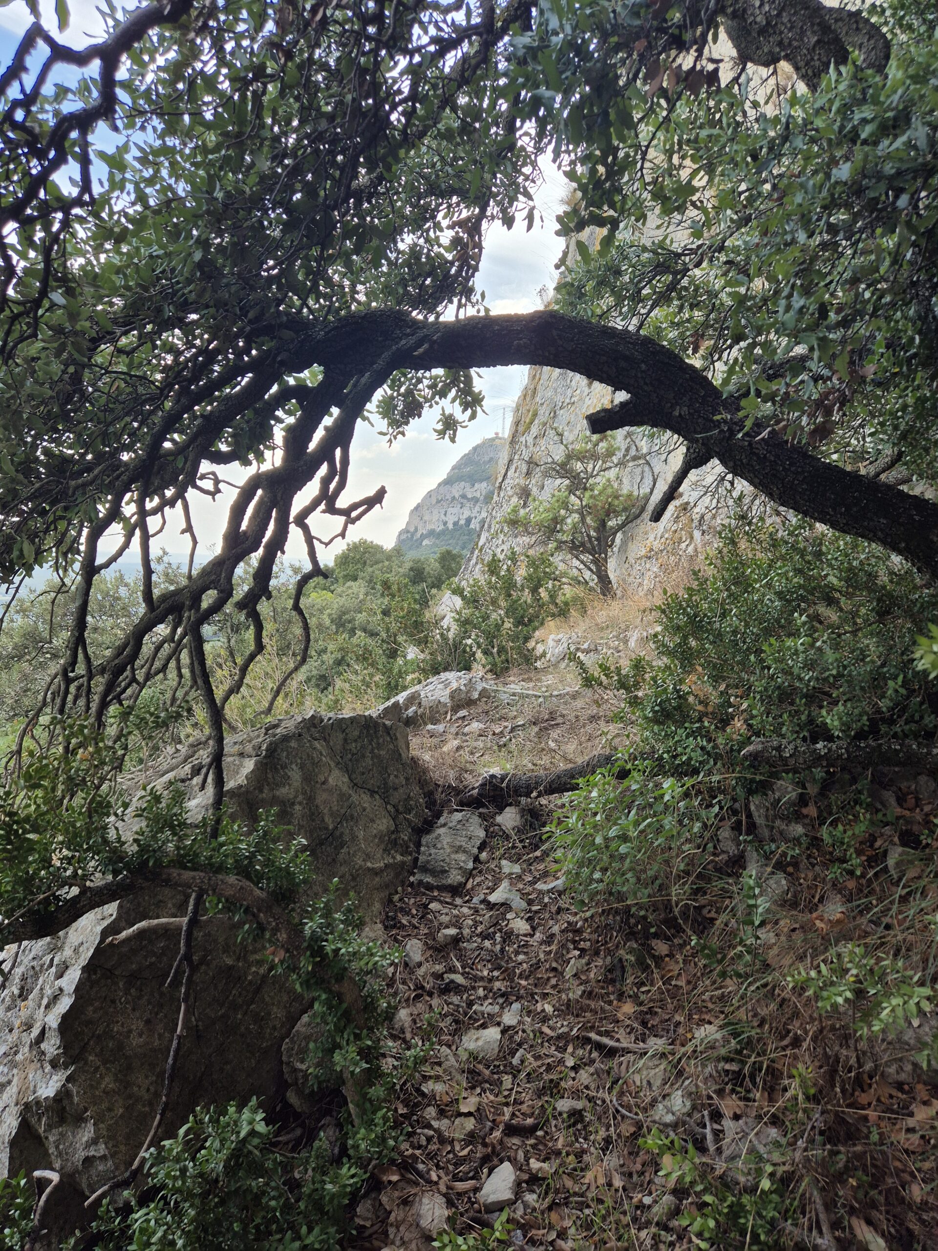 Arrivés à mi pente, on traverse la forêt de chênes verts accrochée aux falaises. Certains ont conservé les éboulis dans leurs racines, d’autres se sont glissés dans les fissures ou rampent au sol.