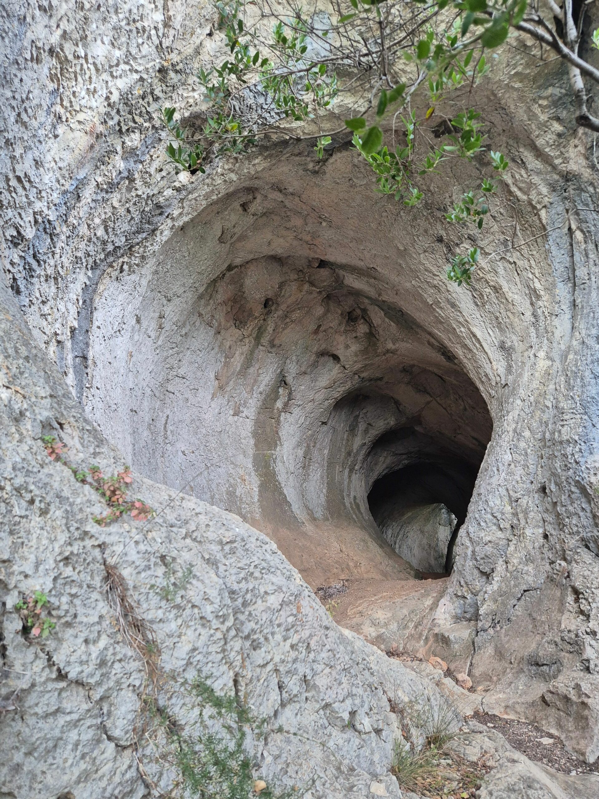 La grotte tunnel, au bout de ce sentier haut perché, est la plus spectaculaire. C’est une galerie creusée en régime noyé à fort débit, au cours du Tertiaire, par un processus qui a duré des millions d’années. Sa forme est dite en trou de serrure : une large ouverture, avec en bas une petite galerie, formée lorsque l’eau n’a atteint que la base de la grotte. Bien gardée par des arbres aux deux entrées, elle est presque invisible dans le flanc de la falaise.