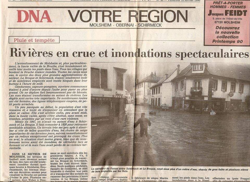 La crue de février 1990 a marqué les esprits par son ampleur. Les eaux ont envahi la quasi-totalité des agglomérations situées dans le lit majeur, qu’elles aient été protégées ou non par des ouvrages artificiels (digues, murs, etc…). Ainsi, à La Broque et Schirmeck, les eaux ont envahi les centres des villages avec une hauteur d’eau atteignant parfois le mètre ; dans la partie intermédiaire de la Vallée à Dinsheim, le centre a été envahi par les eaux notamment du fait de la submersion d’une digue.