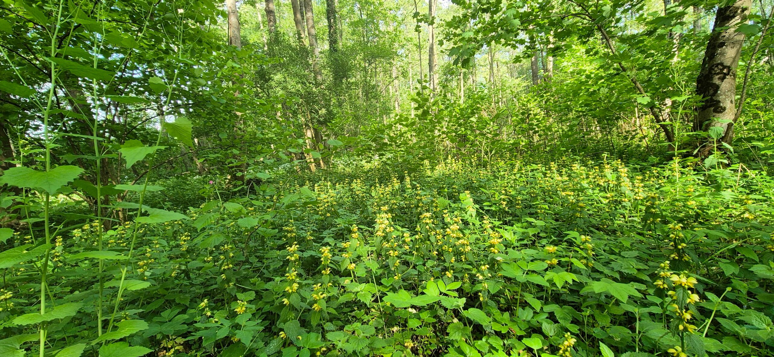 Ci-dessous : une aulnaie-frênaie à orme a reconquis la partie amont de la confluence entre Netzenbach et Bruche. elle est très naturelle (on le voit à la présence de bois morts). Les sous-bois sont luxuriants et signent un milieu riche et productif. Sur la photo 2: le lamier jaune ; photo 3: tapis d’ail des ours: