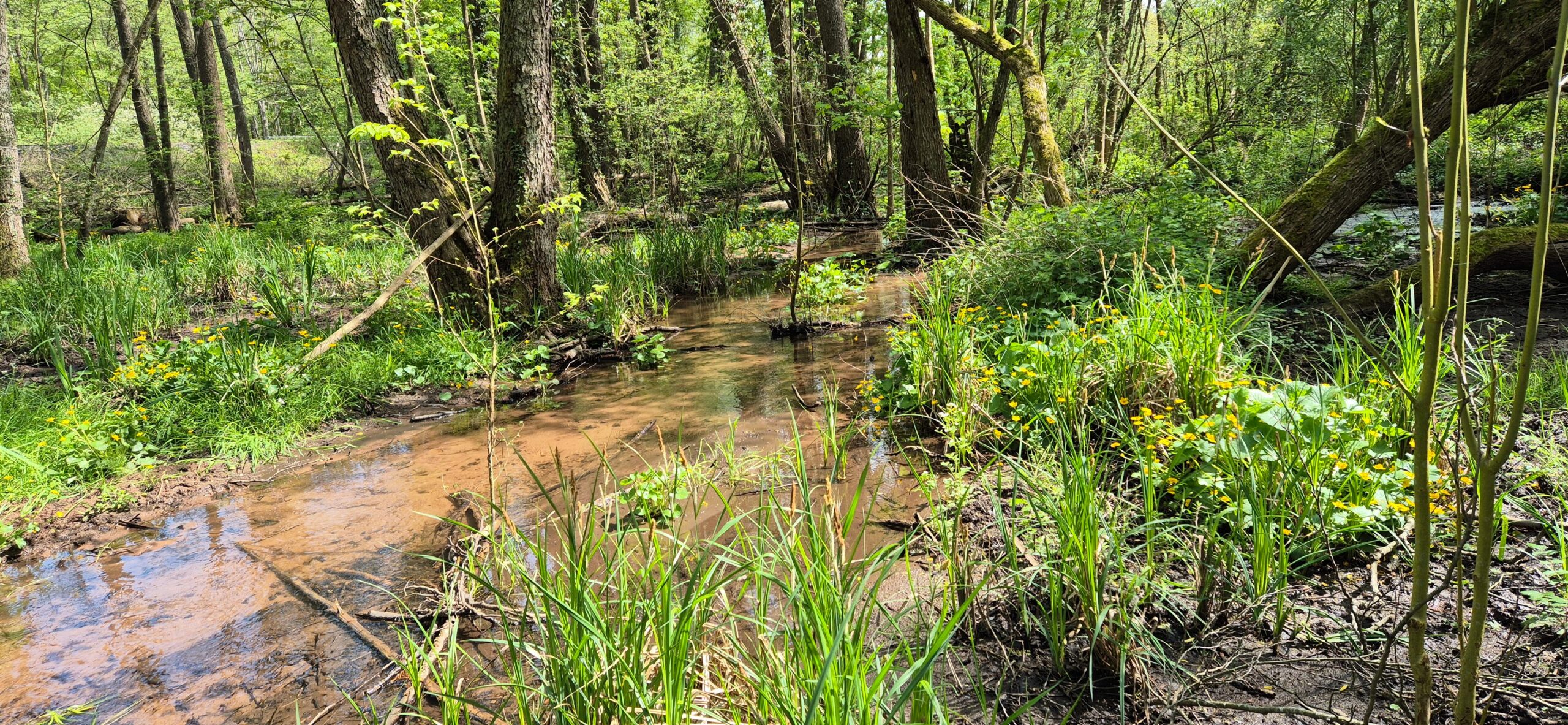Les forêts les plus intéressantes et les plus sauvages se situent à la confluence avec l’Eimerbachel, sans doute parce qu’elles sont très humides. Elles correspondent à une aulnaie marécageuse, milieu très rare dans cette vallée ! Ce petit marécage entre chemin de fer et route est aussi rare que remarquable. Les fleurs jaune vif sont celles du populage des marais (Caltha palustris), en pleine floraison au mois de mai. On y observe aussi Cardamine amara, Valeriana officinalis et Iris pseudacorus.