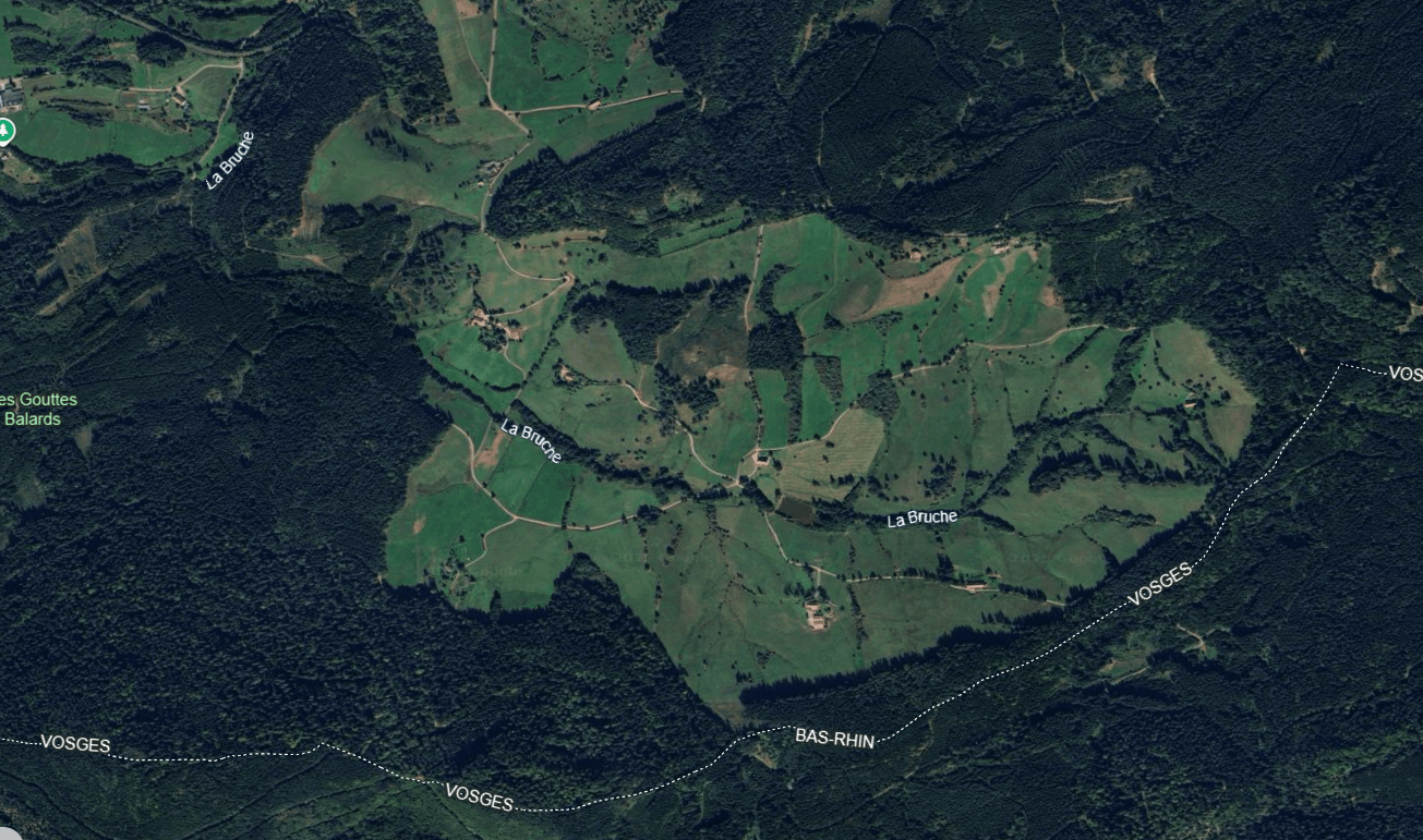 Ci-dessous :les clairières défrichées par les verriers au XVIIIe siècle, et entretenues par la suite par des fermiers. On voit bien le tracé de la Bruche au liseré d’arbres.