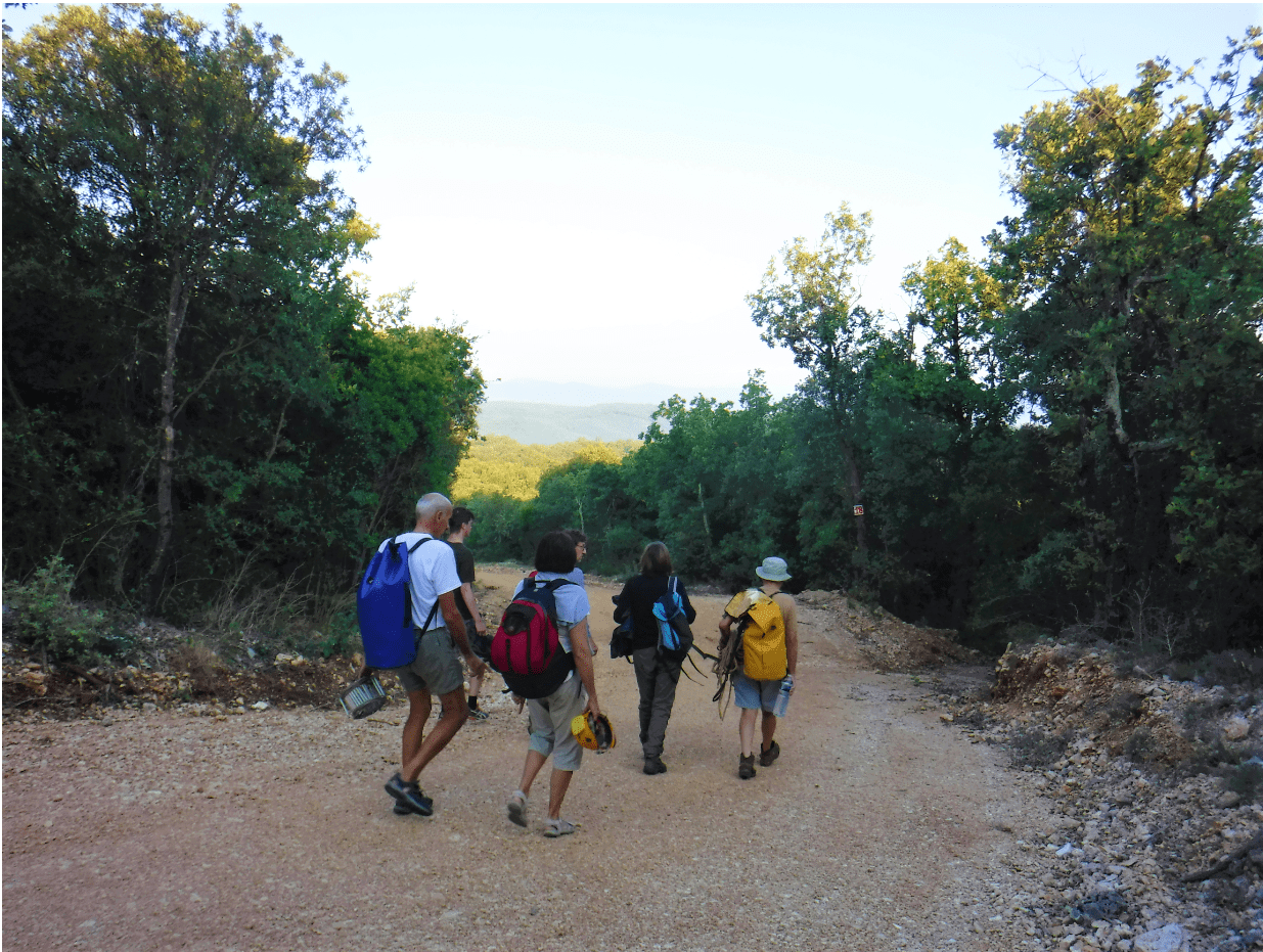 La petite troupe de spéléologues se rend dans le maquis, pour pénétrer dans la grotte par cet orifice discret où débute la visite de la grotte du cerf.