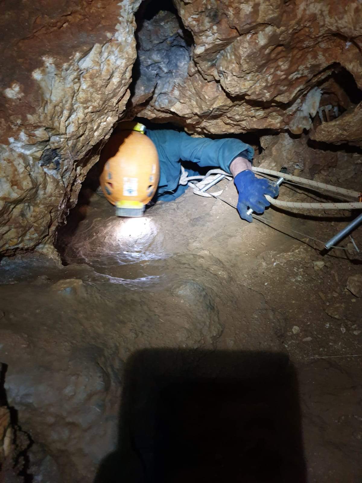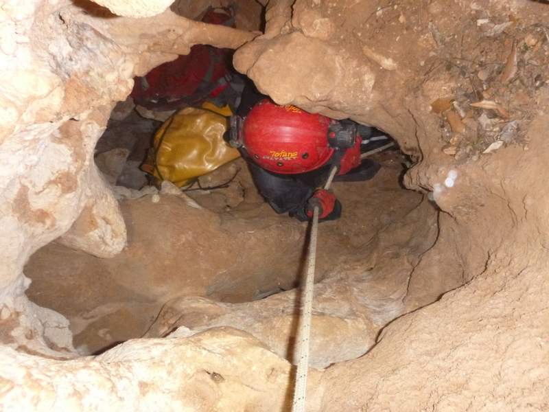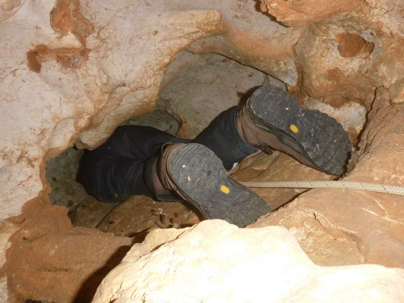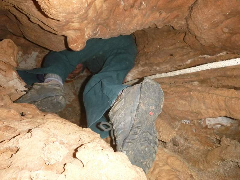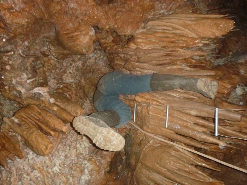 Une des parties les plus difficiles à atteindre était l’étroiture descendante (qu’on dit de type sélectif, car rédhibitoire pour certains !) : 3m dans un passage très étroit et contourné, on y est coincé de toutes parts, et on débouche au plafond d’une salle par le haut. Il faut descendre sur 3m grâce à une échelle pour atteindre le plancher.