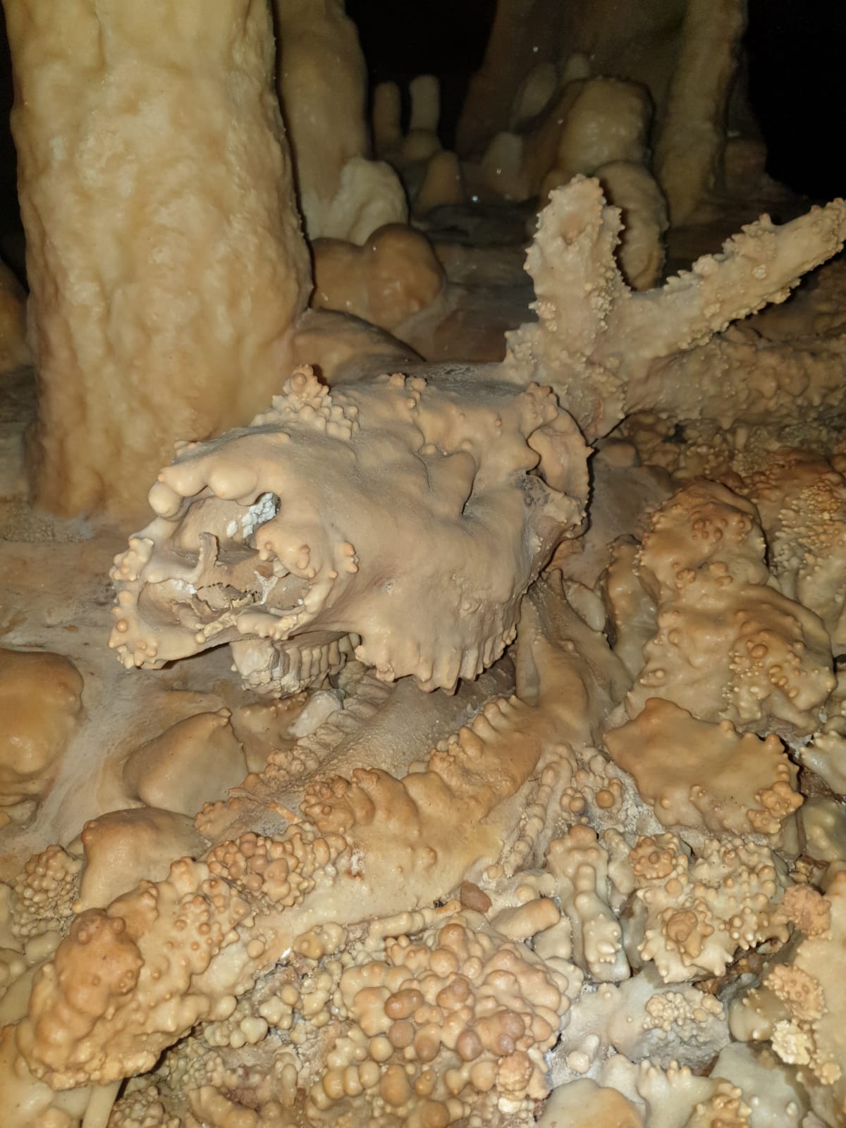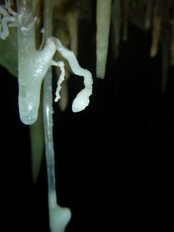 Au cours de ce parcours, loin d’être facile, nous avons pu admirer de superbes concrétions excentriques et formes d’érosion, des « perles », des stalactites en chapelet.