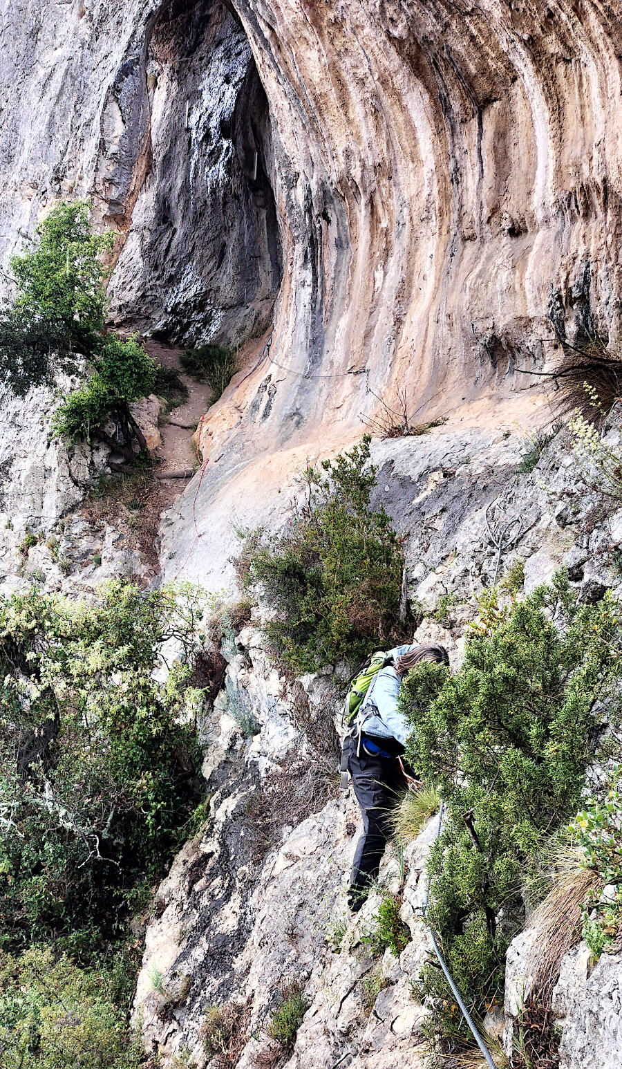 Nous avons suivi un ancien chemin tracé par les moines au Moyen Age, perché au-dessus des crues moyennes de la rivière. Il est devenu très peu visible dans l’épaisseur de la végétation et l’écroulement des parois rocheuses. Ci dessous à gauche: des traces de roues charrettes sur la pierre; au centre un creusement naturel dans le rocher