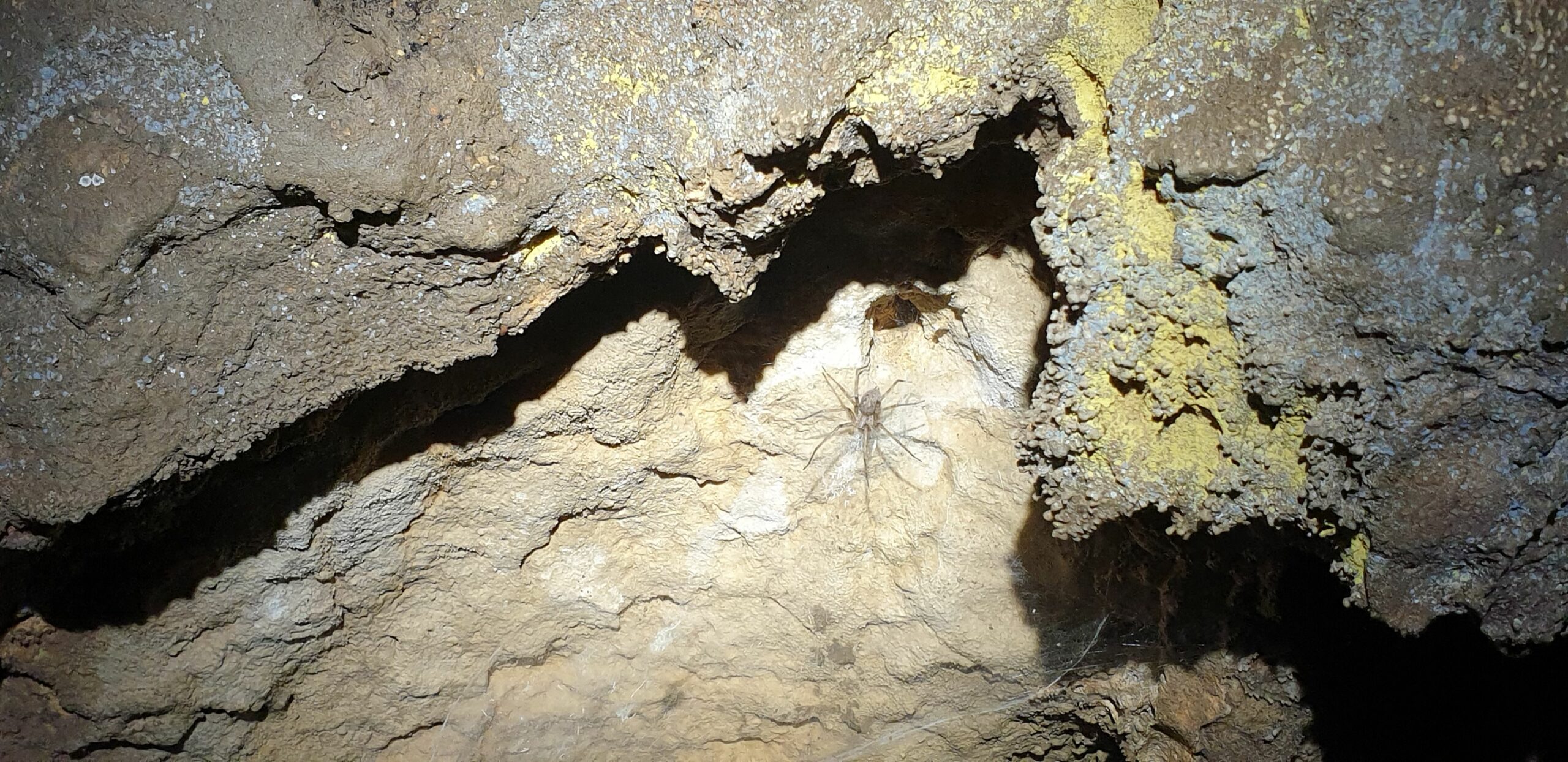 de nombreuses toiles d’araignées tapissant les bordures, avec parfois une araignée (une tégénaire), une de ces toiles a même capturé une petite stalactite qui était tombée du plafond !