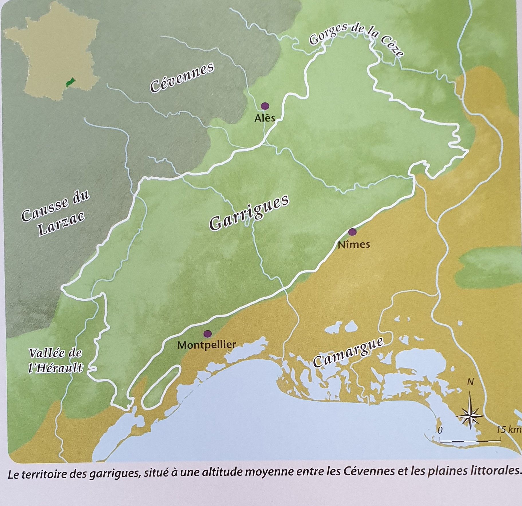 Ci dessus : à gauche et au centre, situation des gorges au sud de la France, et dans le complexe écologique des garrigues. A droite, les gorges. Carte de l’IGN