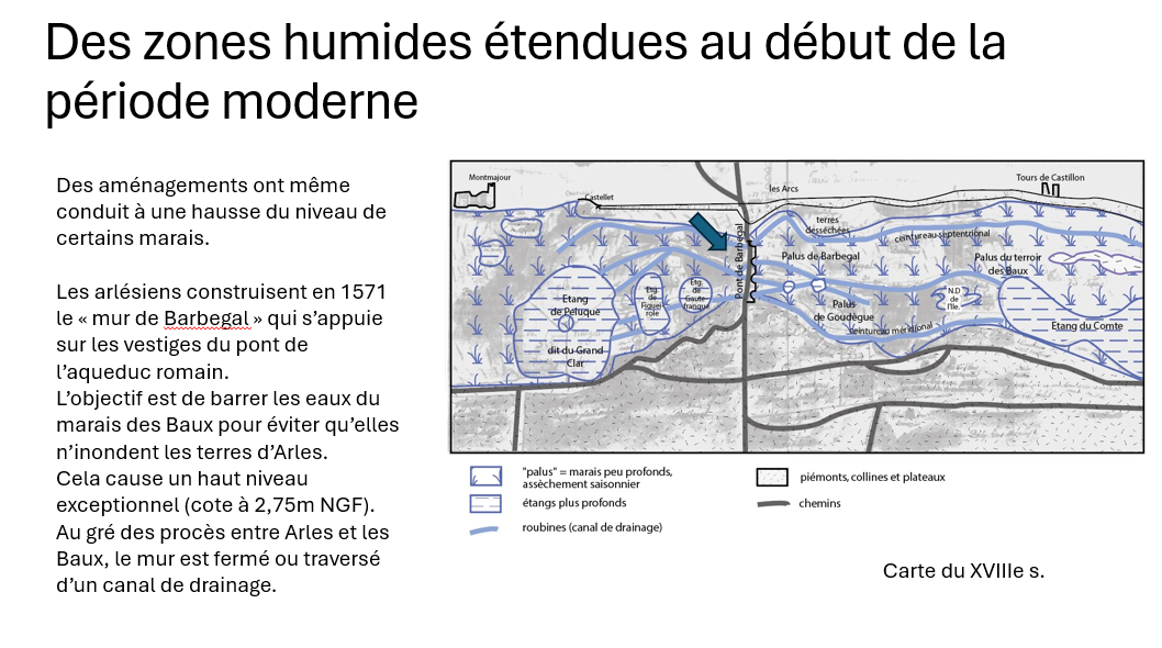 Les marais d’Arles, proches du Rhône, ont été très rapidement connectés à l’aquifère du Rhône, alors que le marais des Baux plus à l’Est en est séparé par le seuil relativement imperméable de Barbegal.