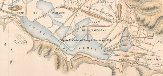 La carte dessine de façon précise les buttes du Castelet-Montmajour-Cordes, ainsi que la série d’étangs allant de l’Etang du Comte au Petit Clar. On voit aussi la succession de systèmes de drainages, mais pas ceux (qui existaient déjà) du Marais des Baux. On voit au nord de l’Etang du Comte une série de petits étangs, au sein d’une zone humide plus grande, qui doit correspondre à l’ensemble du marais des Baux.