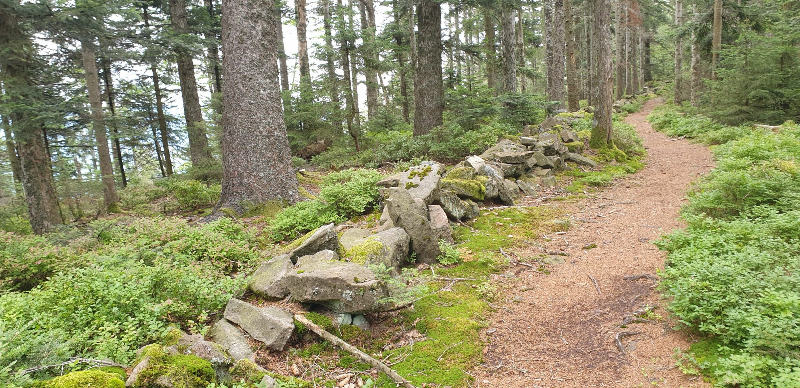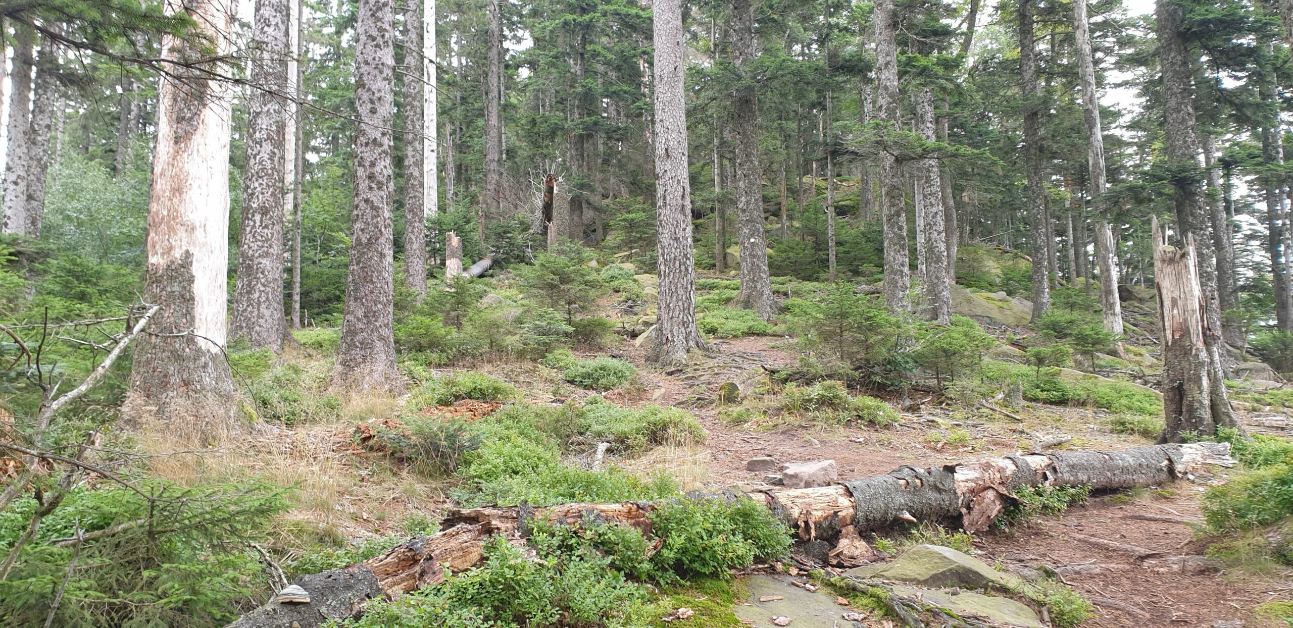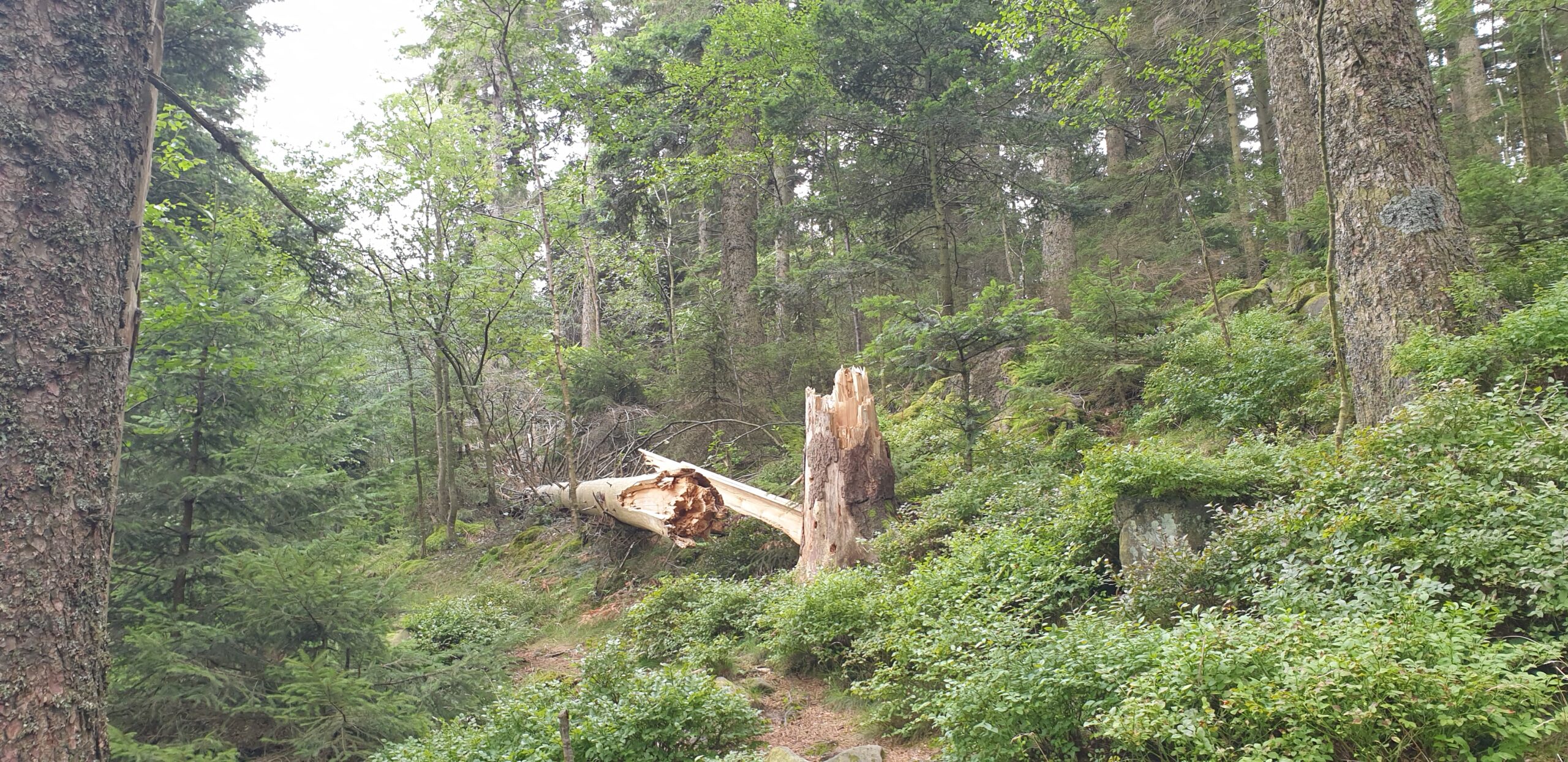 Ce sentier forestier, sur le flanc Est du Grossmann, inclut de belles formations à hêtre et sapin, mais aussi une impressionnante parcelle d’épicéas morts suite aux attaques du scolyte.