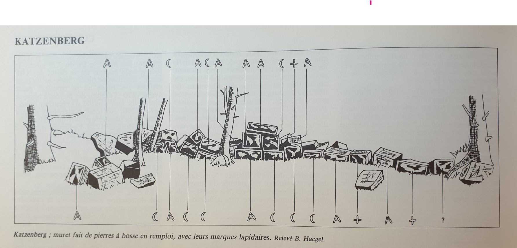 L’âge d’édification du mur n’est pas connu mais pourrait remonter au Moyen Âge, avec certainement des restaurations ultérieures. Après le mur le sentier suit la limite forestière. En maints endroits, il est nettement encaissé, vestige d’un ancien fossé, une autre marque ancienne de limite. Puis de nouveau une borne portant la lettre M et la date de 1784. Ce sentier mène au rocher de Mutzig.