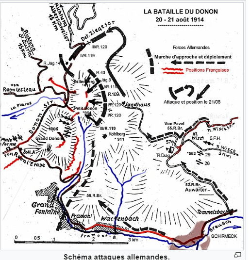 Du 18 au 21 août les Allemands contre-attaquent pour rejeter les français de l’autre-côté de la frontière (qui passe au pied du Donon, par les villages de Raon-sur-Plaine et Raon-lès-Leau). Le 21 août le Petit Donon est perdu. Les Français se replient, abandonnent leurs morts et quittent le massif du Donon. Les Allemands conservent l’inscription française et rajoutent une inscription en allemand, dans laquelle ils se glorifient d’avoir rejeté les français pour toujours (« für immer nach Frankreich zurückgeworfen… »)