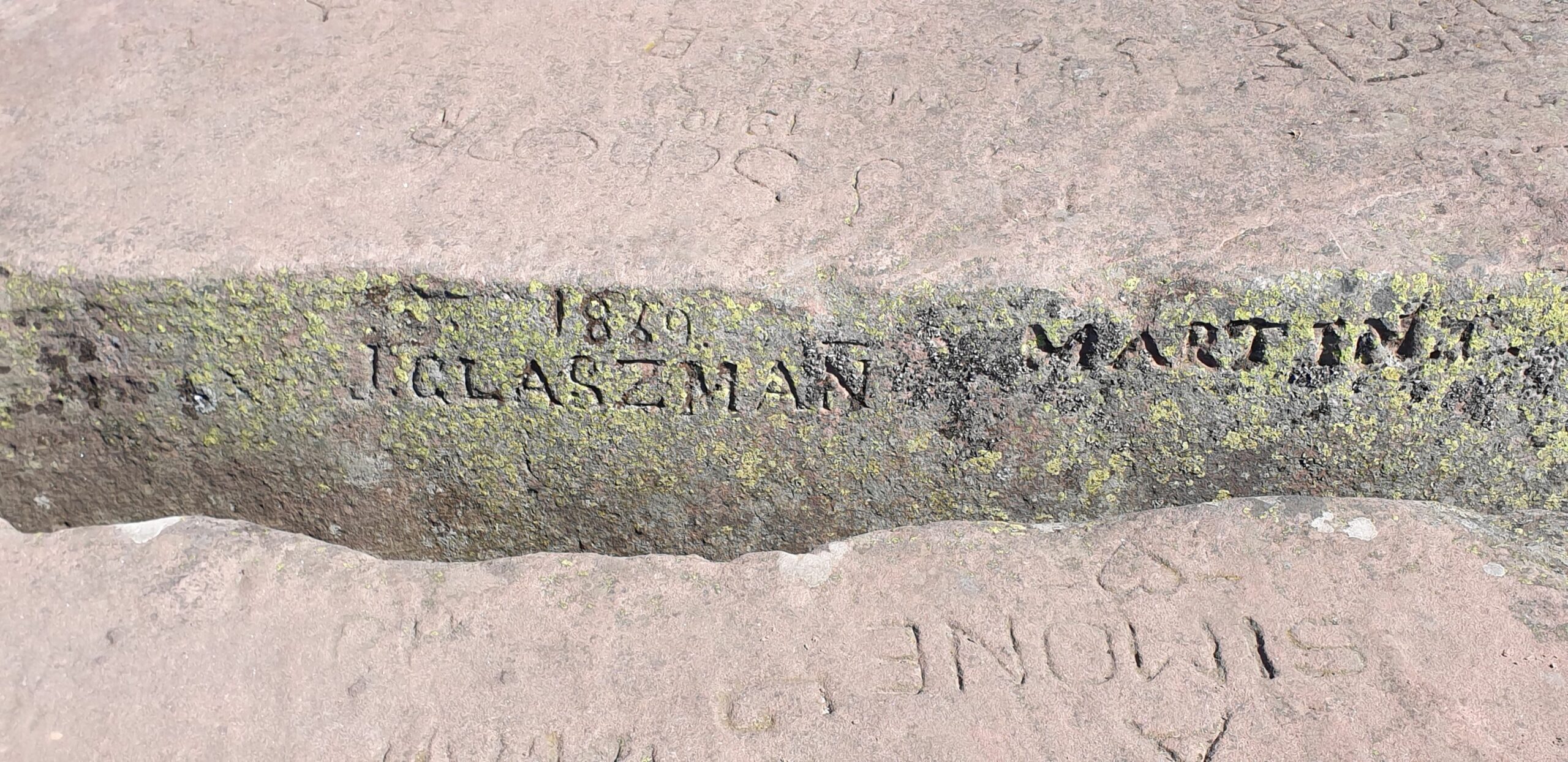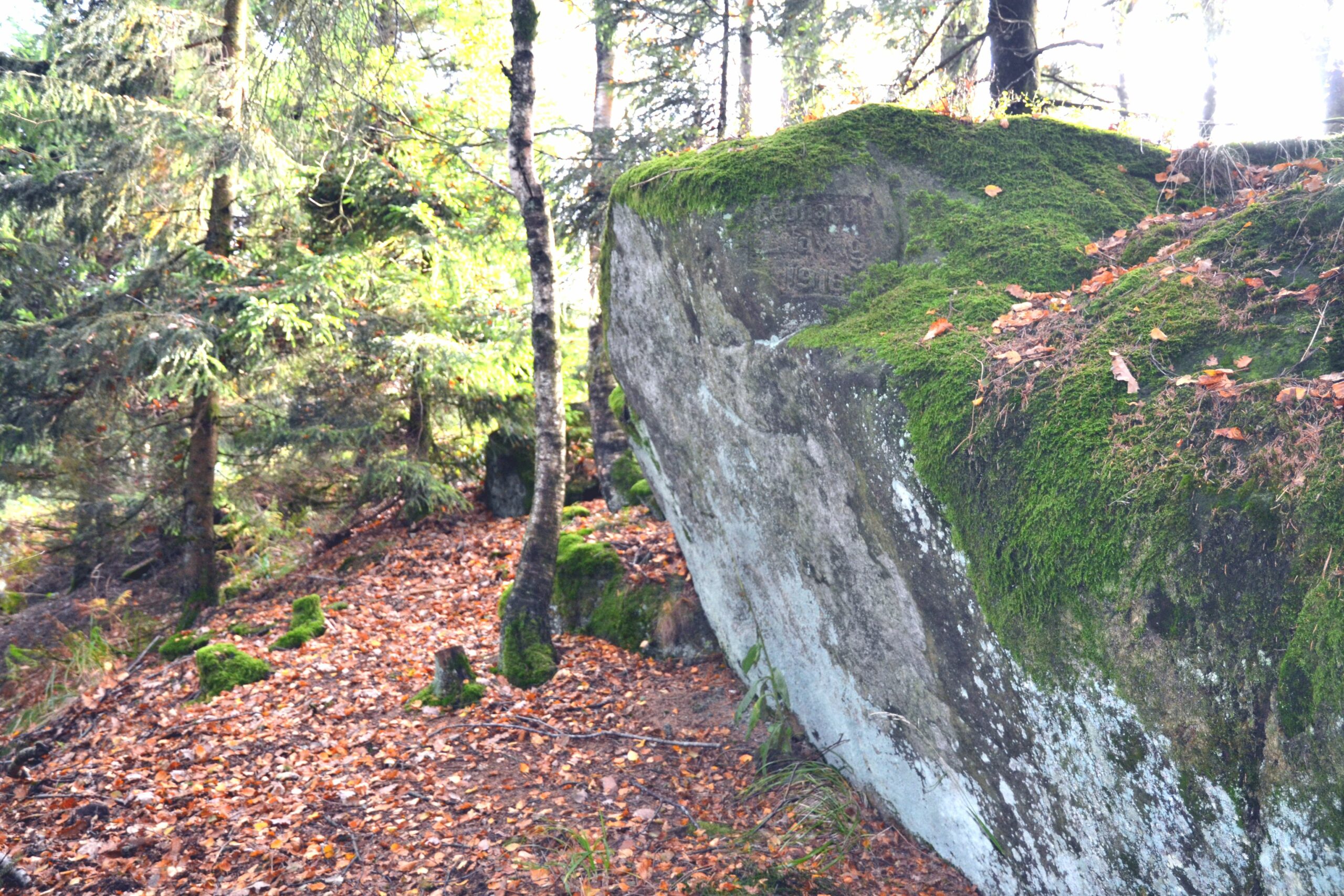 La dernière photo 3 à droite au-dessus et ci-dessous correspondent au même rocher sur lequel le tailleur de pierre qui a probablement gravé la plaque commémorative en 1916 a apposé son nom: Gebhardt/Ludwig/1916.