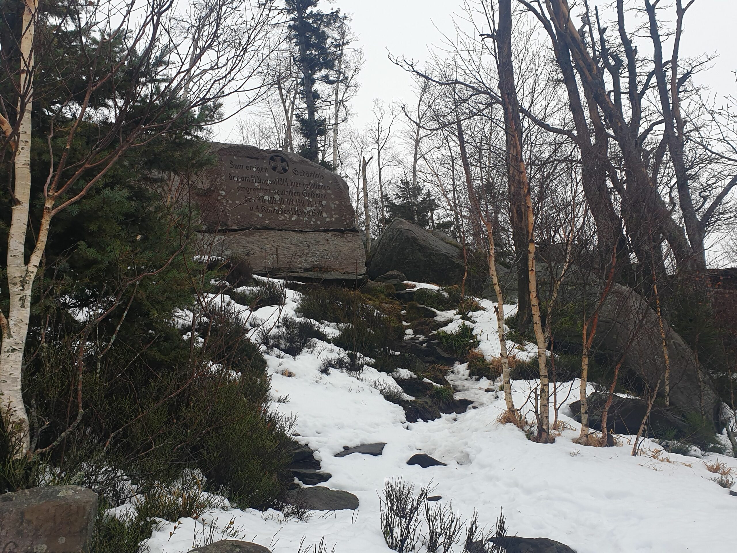 J’ai effectué plusieurs visites sur le site, au printemps et en hiver. La visite commence par une première stèle commémorative de 1m20 de hauteur, dénommée le Schubertstein dressée en 1915 et se trouve au col qui sépare le Petit Donon du Donon.
