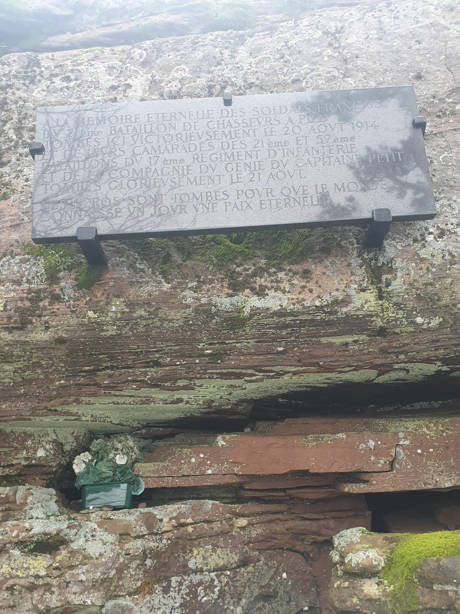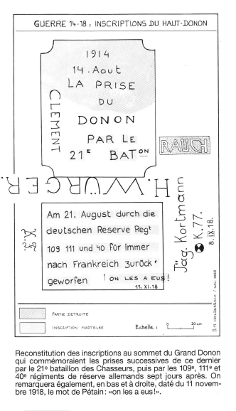 « Le 11 novembre 1918, jour de l’Armistice, quatre garçons de Schirmeck montent au Donon, voient l’inscription (qui avait été gravée par les Allemands lors de la reprise du Donon) et rajoutent à la suite du texte allemand ”On les a eu” et la date 11 XI 18. Ils signent de leurs initiales (visibles sur ta photo, sous le cadre). Fanfaronnant ils redescendent à Schirmeck, rencontrent leur instituteur et lui racontent leur ”exploit”. Les connaissant bien, celui-ci leur demande comment ils ont écrit tout cela. Évidemment ils étaient tombés dans le piège du participe passé… L’instituteur leur ordonna de remonter de suite au Donon et de corriger leur faute de grammaire. C’est ce qu’ils firent. Et comme ils n’y avait plus de place ils ont rajouté le ”s” à l’extérieur du cadre. C’est bien visible sur ta photo ! Cette anecdote été rapportée par le dernier survivant des quatre garçons »