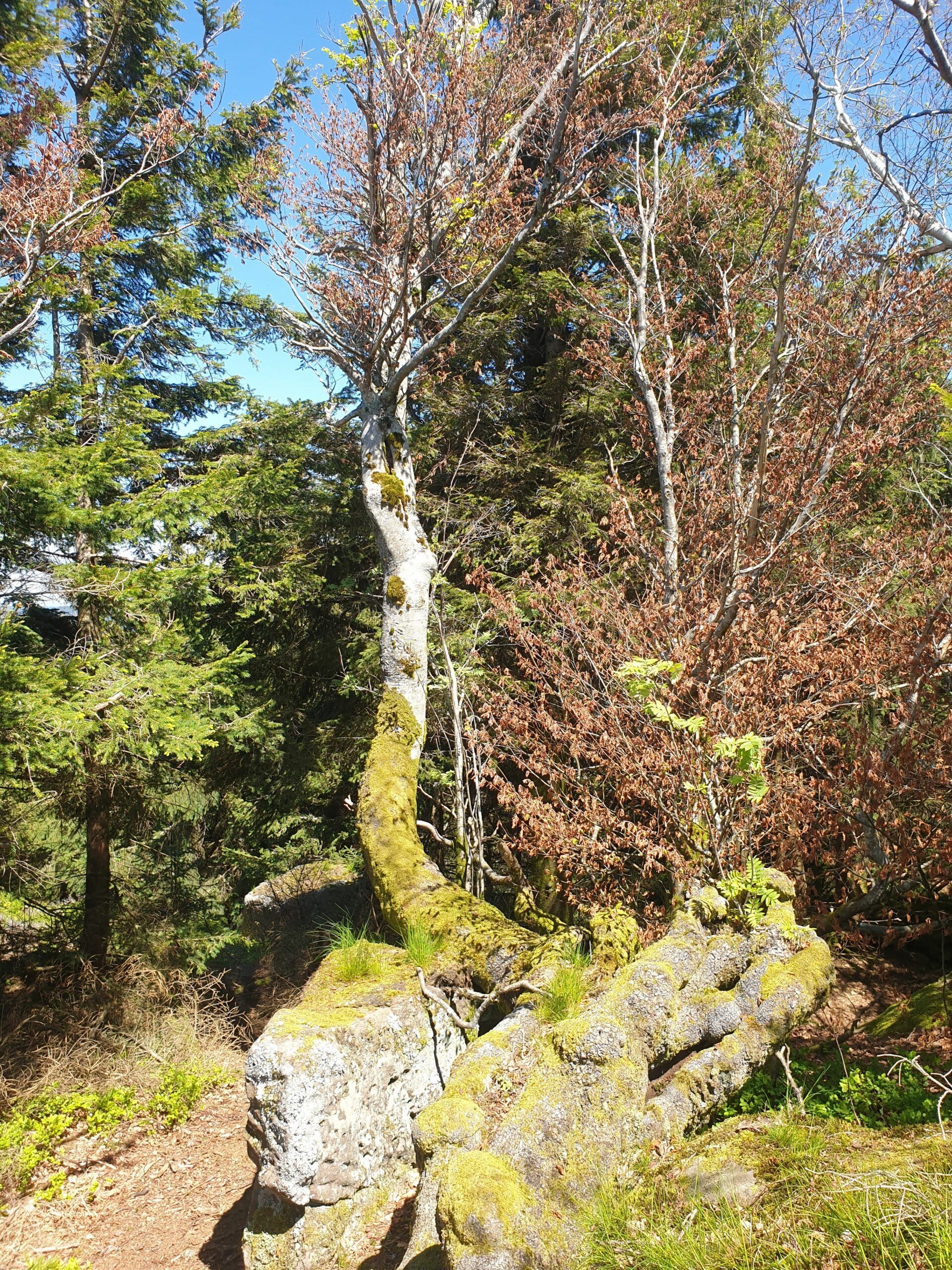 La végétation plutôt clairsemée qu’on peut voir sur ces photos serait liée aux effets dévastateurs des tempêtes du XXe siècle. En effet, l’ensemble du massif du Donon subit depuis près de 100 ans des plantations massives d’épicéas, qui rendent tout cet écosystème forestier très sensible aux perturbations naturelles. Actuellement, le réchauffement climatique est un autre stress qui fragilise encore plus ces « forêts » artificielles.