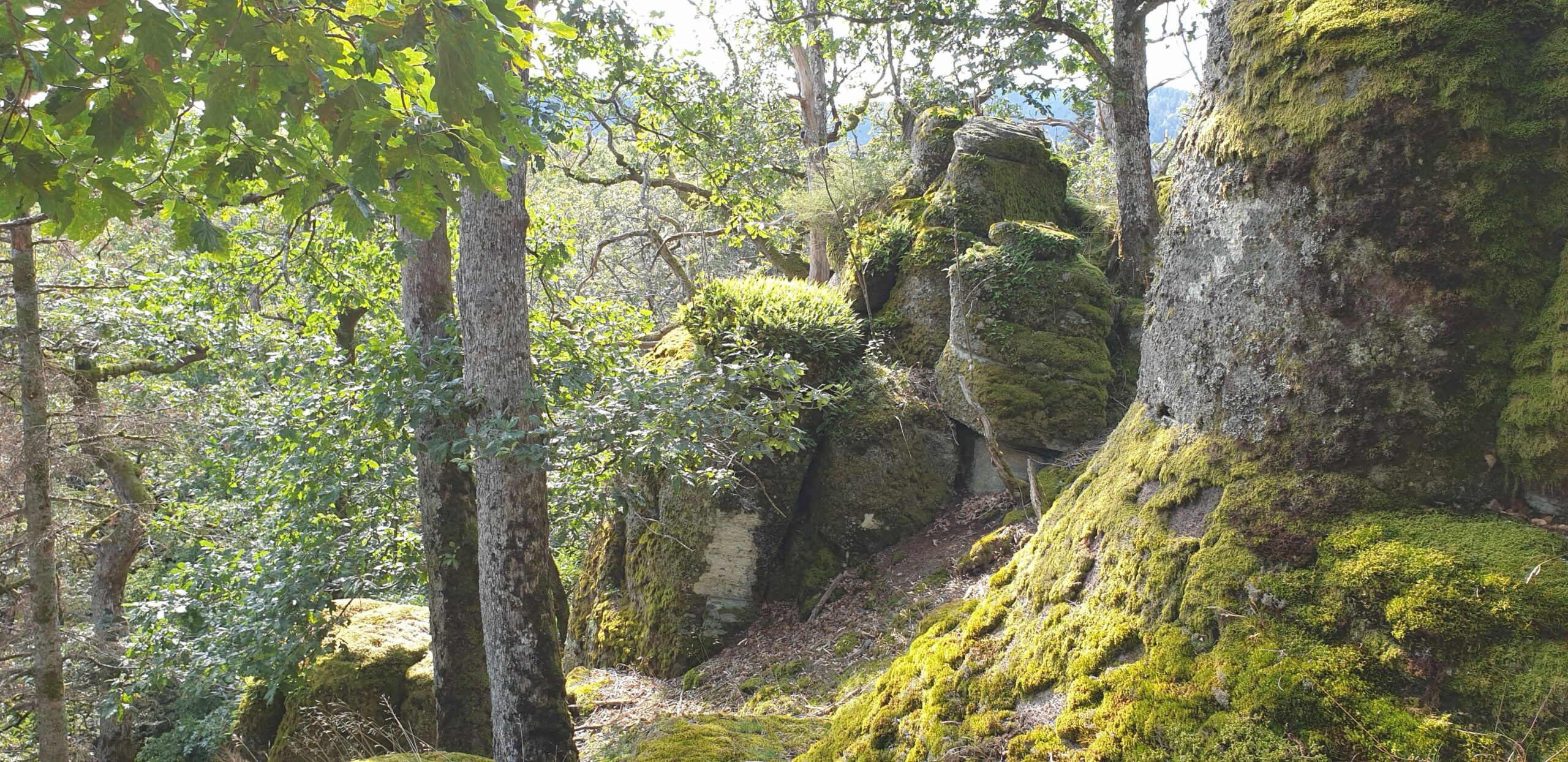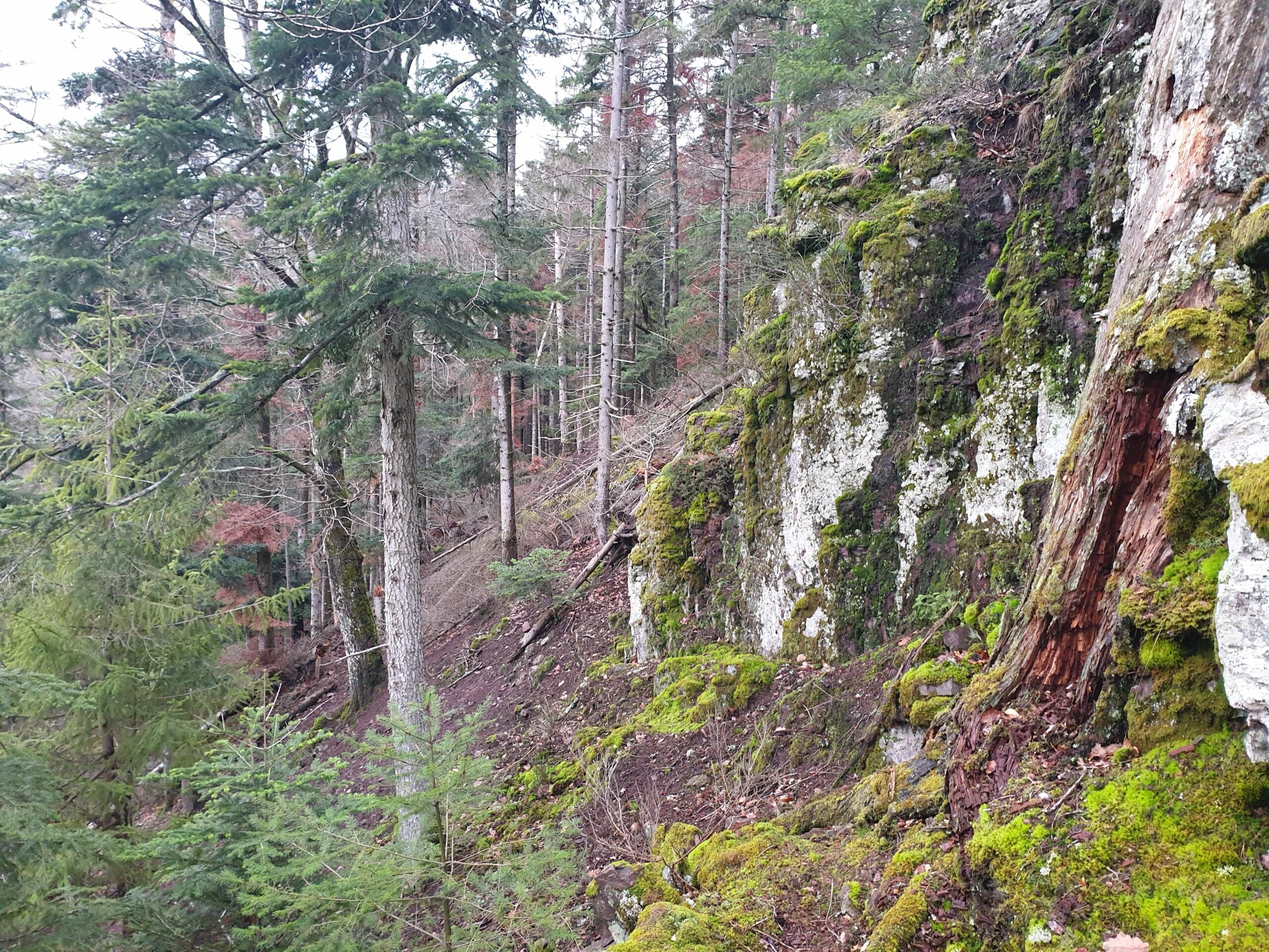 La vie est difficile pour ces rochers : le sol est quasi absent, la pente forte. Les arbres morts y sont nombreux. Une vraie petite zone de haute naturalité !
