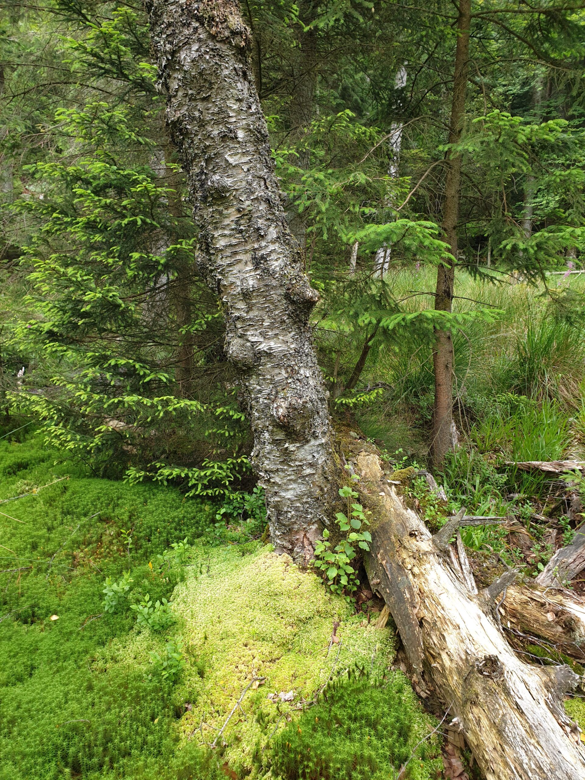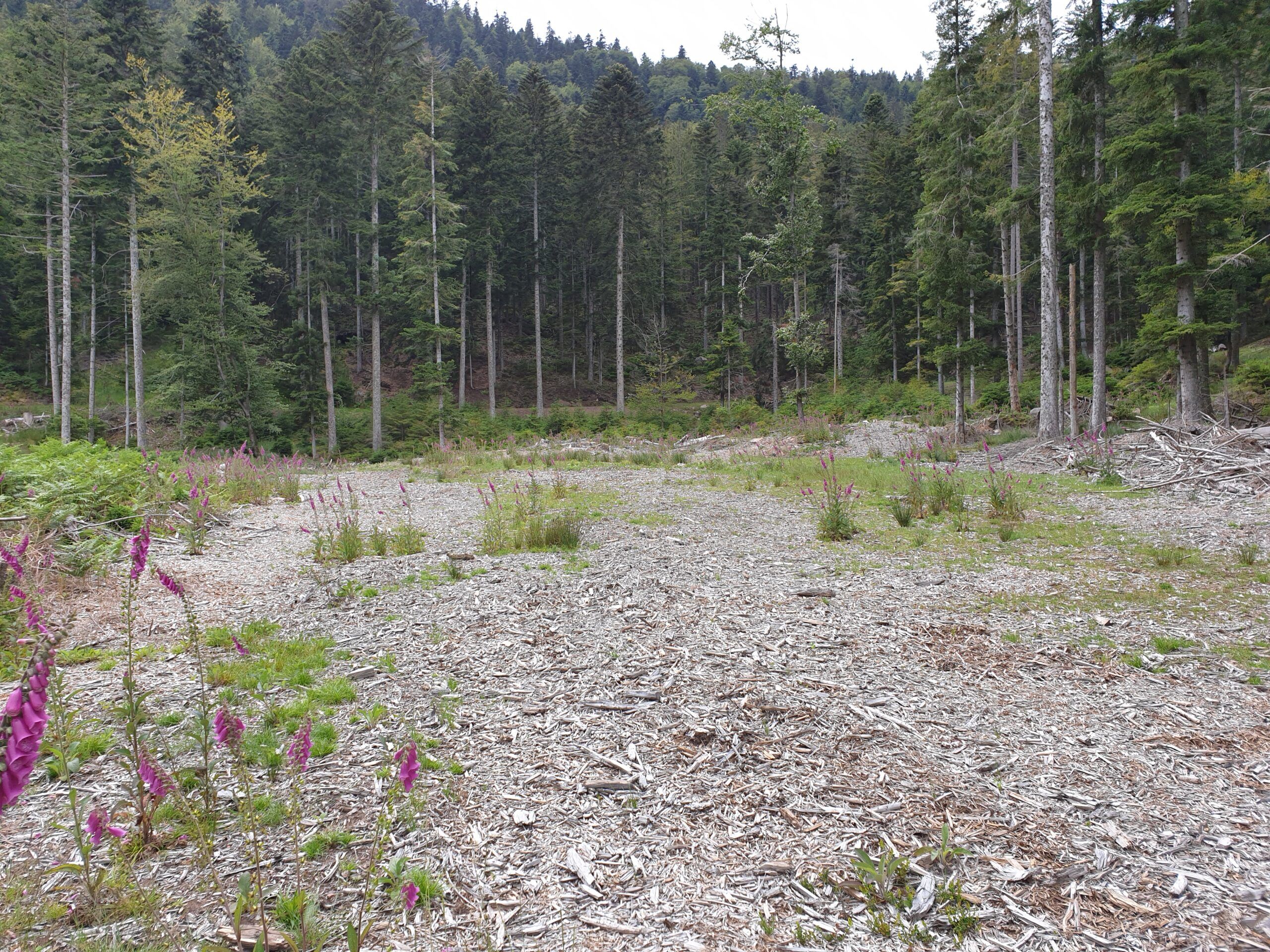 La partie centrale de la tourbière a été pâturée et est dépourvue d’arbres. En revanche, autour de la tourbière, la forêt est revenue spontanément, comme à Windsbourg.