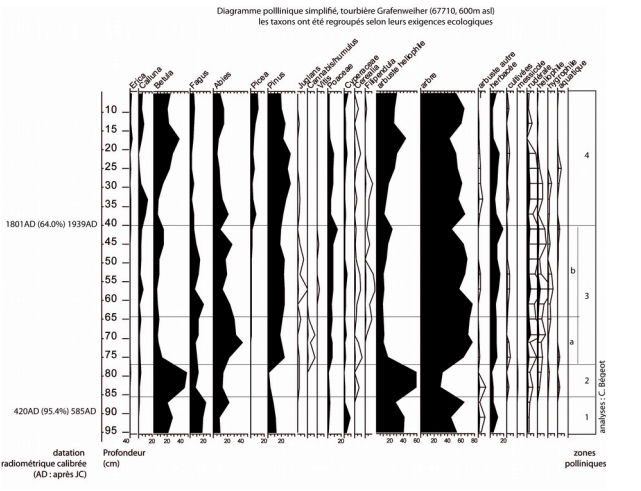 L’épicéa, qui n’est pas indigène à la région, n’apparaît qu’au cours du XIXe siècle, devenant abondant vers le haut de la séquence avec les plantations massives de l’époque allemande fin du XIXe siècle.