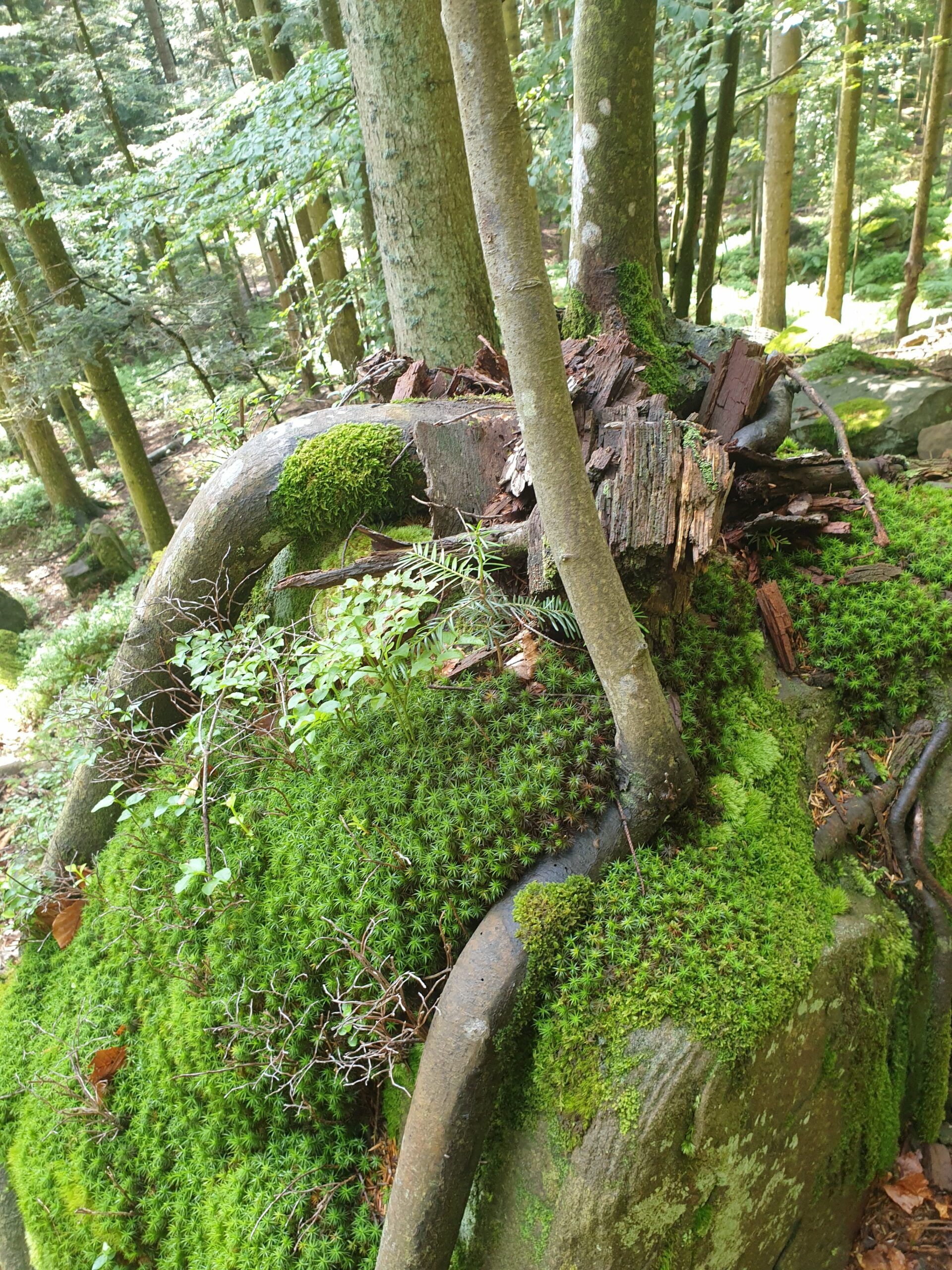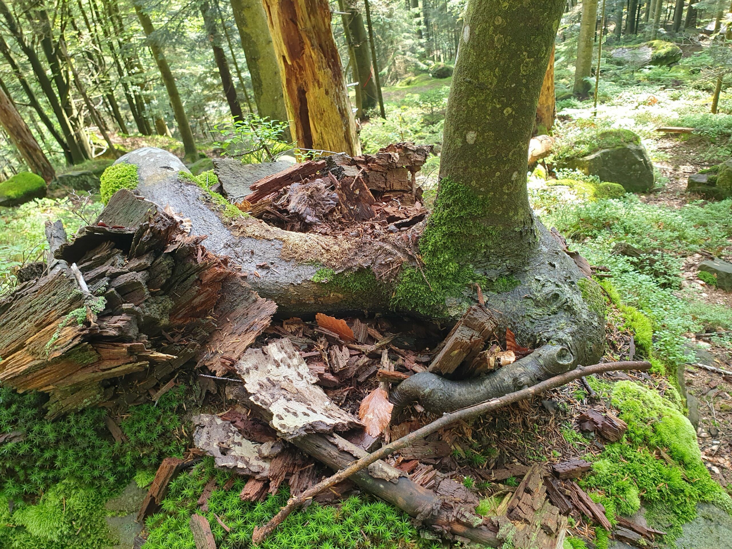 Quelques autres petites observations intéressantes: comme les pentes de la tourbière sont riches en gros blocs de rocher, on peut y observer des adaptations étonnantes des arbres qui arrivent à y survivre, parmi le hêtre et le sapin.
