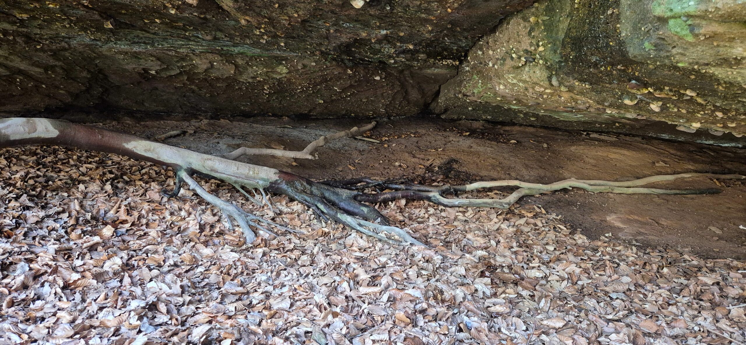 Ci-dessous, photos 1 et 2 : ce hêtre a été déporté par son poids dans le vide, et ne tient plus que par ses racines qui s’enfoncent profondément dans les fissures de grès. Photo 3: ce pin a traversé toute la paroi de grès pour s’enraciner au bas du talus de la falaise.