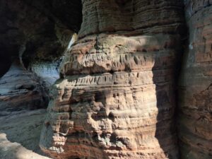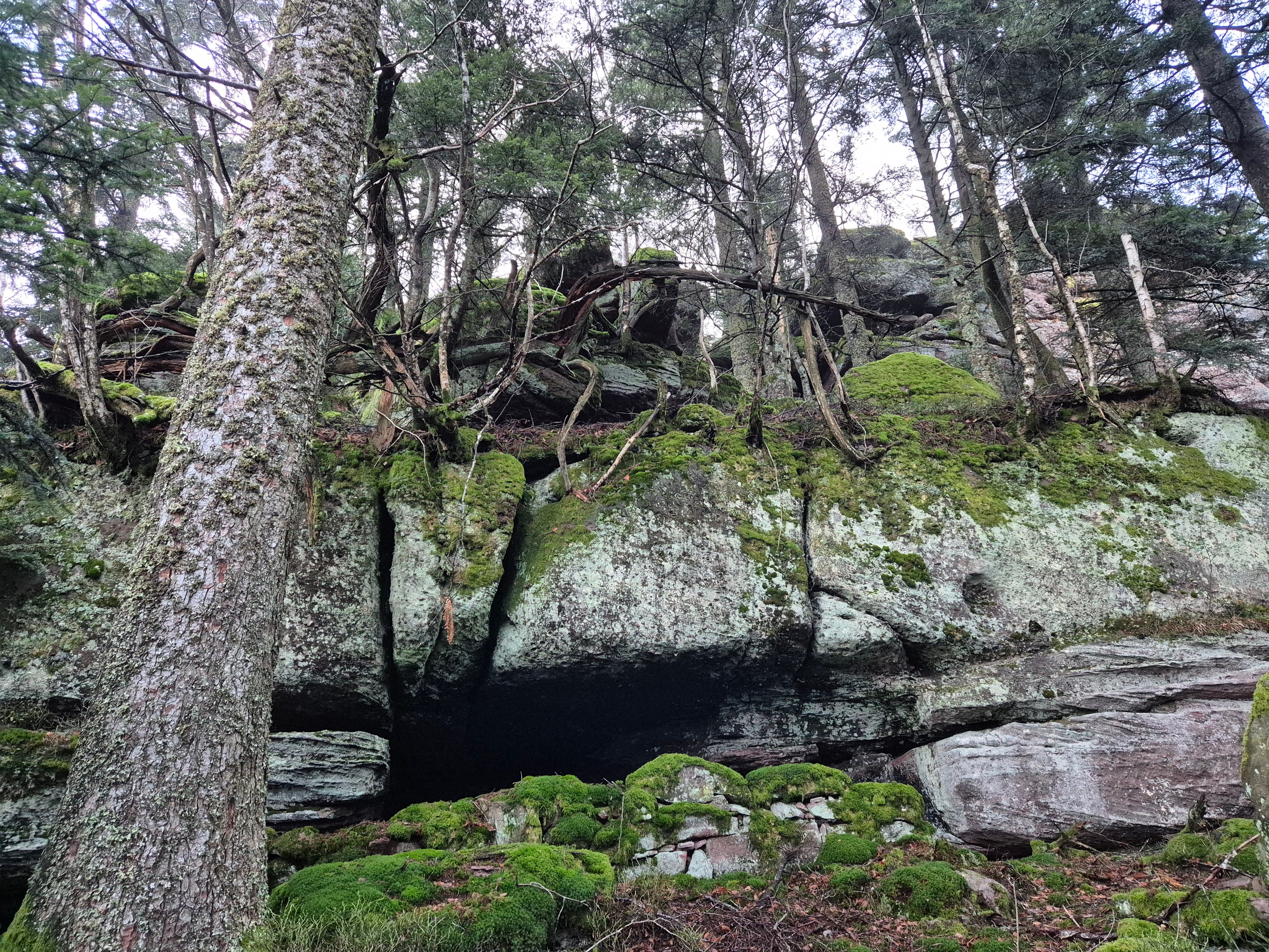 Ci-dessous: deux photos de falaises de grès dans les Vosges du Nord. La première photo est prise dans une des plus impressionnantes falaises avec 25m de hauteur et une longueur de 700m (photo Loïc Duchamp).. En contraste, la deuxième photo correspond à la falaise la plus étroite des Vosges: car elle ne tient que par quelques mètres à la base.