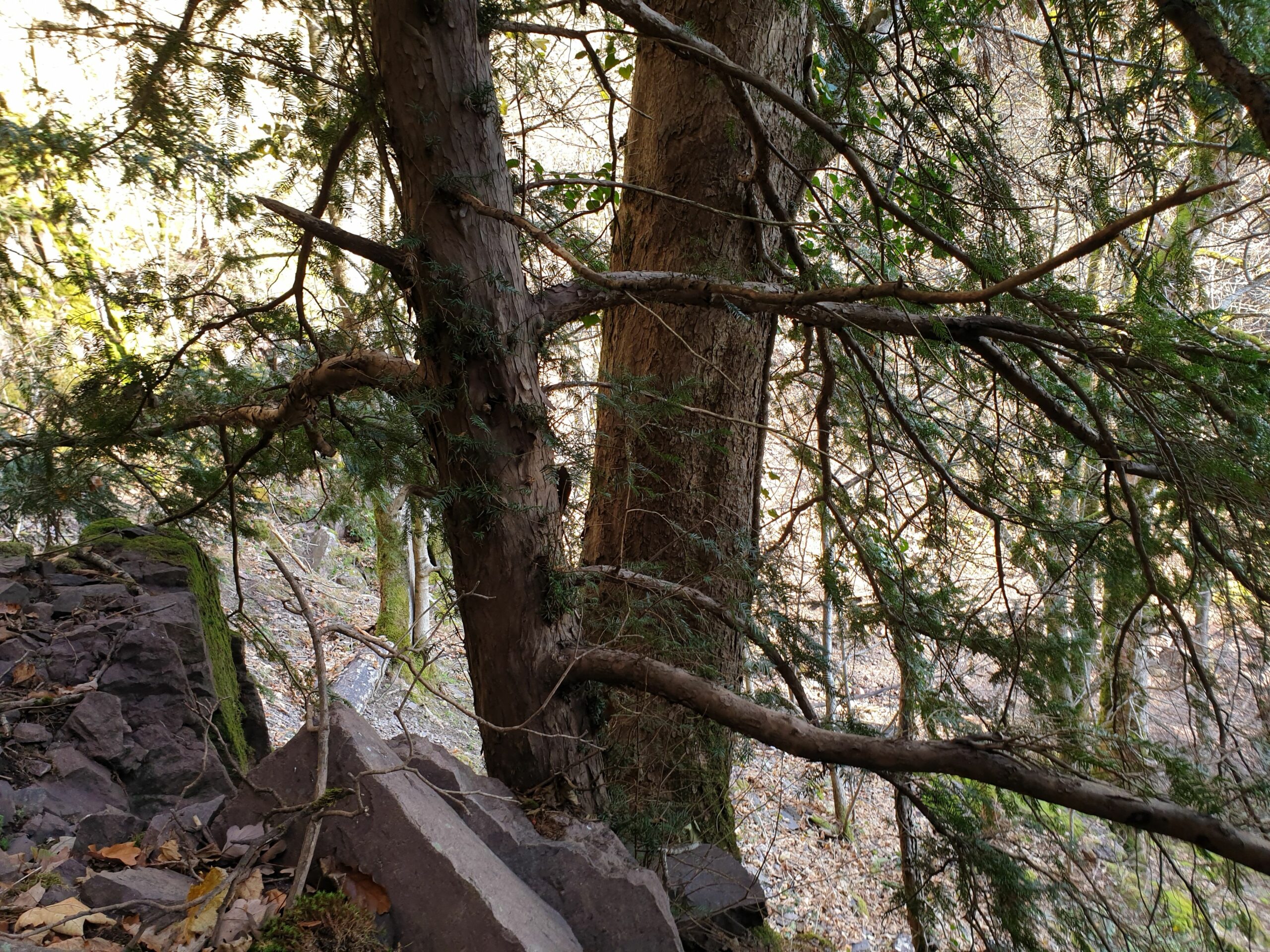 Dans certains cas, les arbres des falaises sont relativement nombreux, et forment de petites communautés autonomes, riches en espèces devenues rares dans les forêts adjacentes exploitées. Certains vivent sans doute très longtemps, comme l’if, qui est devenu, dans les Vosges comme partout dans son aire de distribution, une espèce très rare au sein des forêts, victime de destructions directes ou de surexploitations. Les ifs des falaises présentent des architectures complexes, où il est parfois difficile de distinguer le tronc des axes racinaires ou aériens. Leur âge n’est pas évalué, mais certains sont sans doute pluricentenaires. Au pied de l’une des falaises les plus emblématiques des Vosges, au Nideck, se trouve le patriarche de l’espèce pour le Grand Est : il pousse en toute discrétion au pied d’une falaise abrupte, surmontant un éboulis instable : il aurait dépassé le millénaire, ce qui en fait un des éléments les plus âgés des forêts vosgiennes.