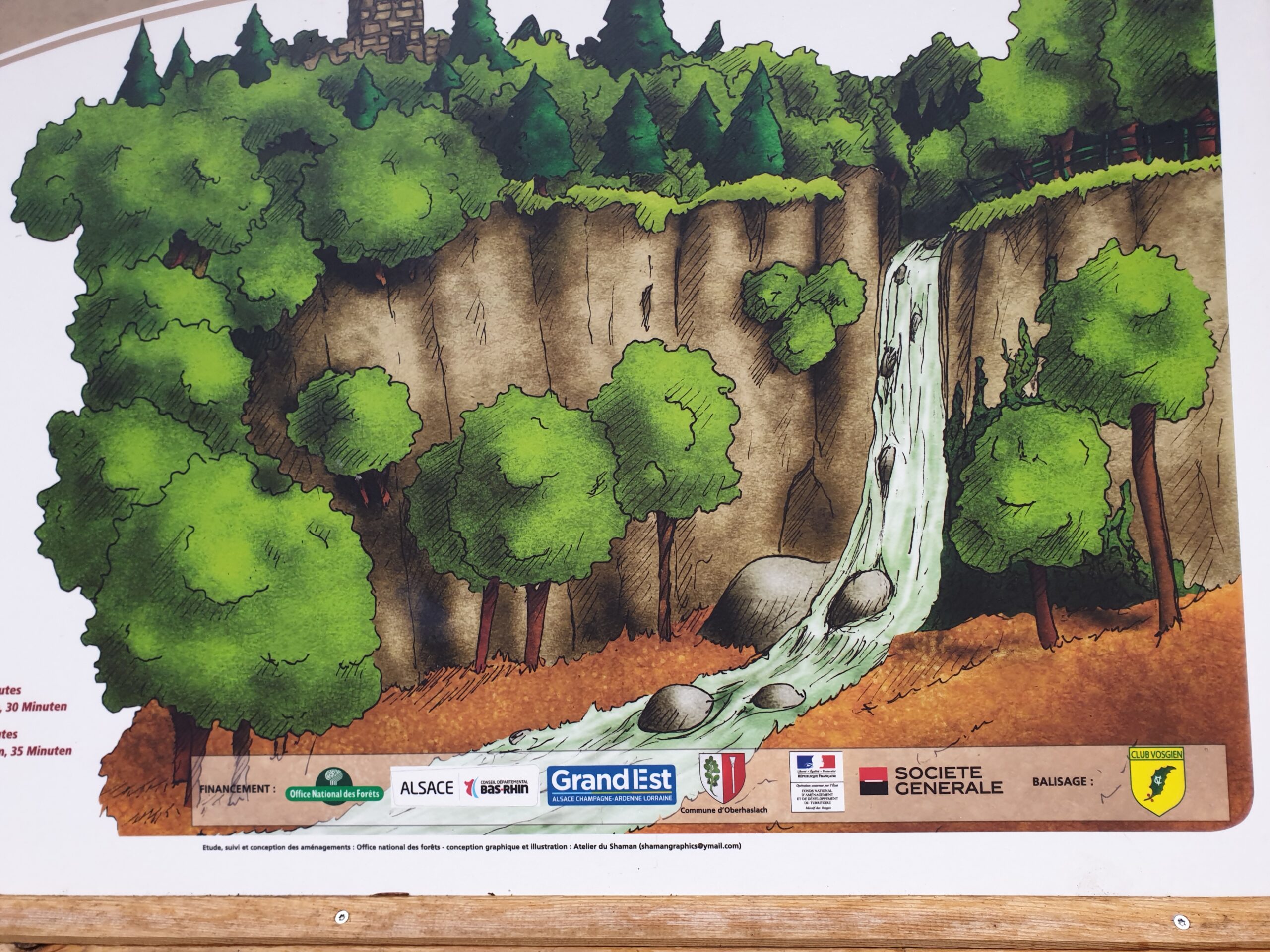 On reconnait, dans ce site dévasté par une coupe de grande envergure, le château du Nideck au fond, et la muraille de coulées volcaniques de la cascade