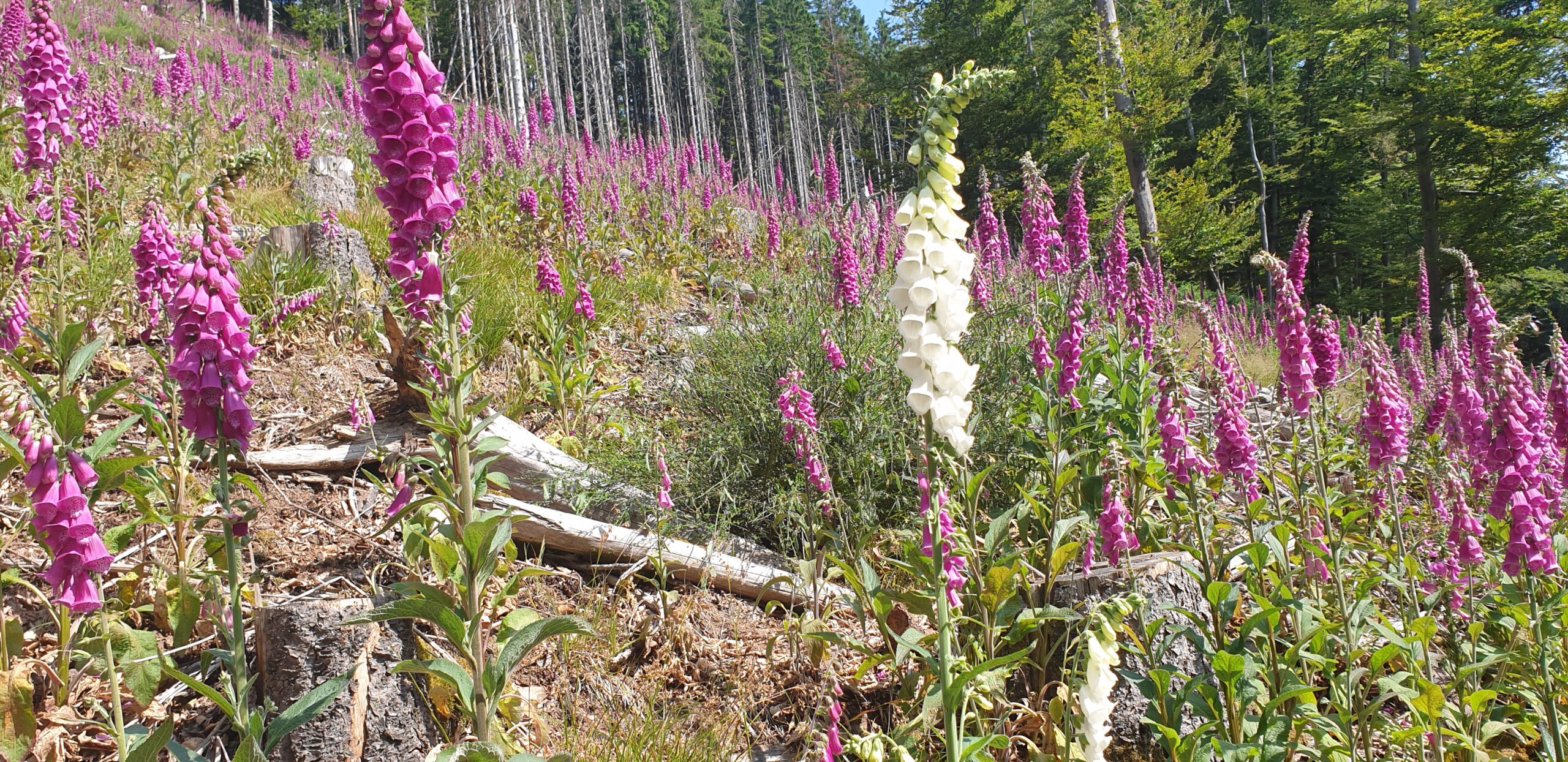 Sur la photo de droite, prise au-dessus du Nideck, une coupe ancienne d’épicéas victimes des scolytes a stimulé la germination des digitales. Ces plantes, qui ne vivent que deux ans, fabriquent une hampe florale rose magnifique. De temps en temps apparait une hampe blanche, signe d’un caractère rare surgissant dans un contexte de fortes densités des digitales.
