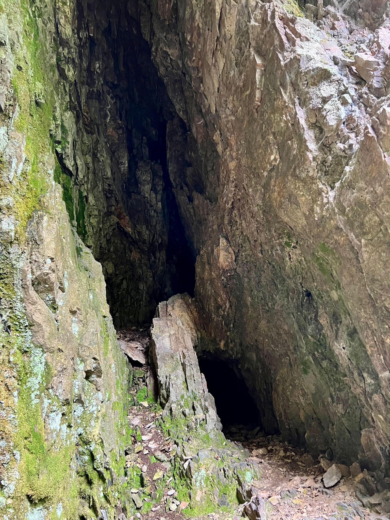 Sur le terrain, on peut visualiser les anciennes nuées ardentes en contemplant les superbes falaises qui encerclent le fond du vallon. Ces nuées se sont déposées en épisodes d’intensité variable sur une longue durée de temps, puis se sont consolidées, donnant des tufs, ou cendres agglomérées. Ci-dessous quelques curieuses formations dans les coulées de lave à gauche, un grand abri sous roche, à droit le début d’un tunnel de lave ?