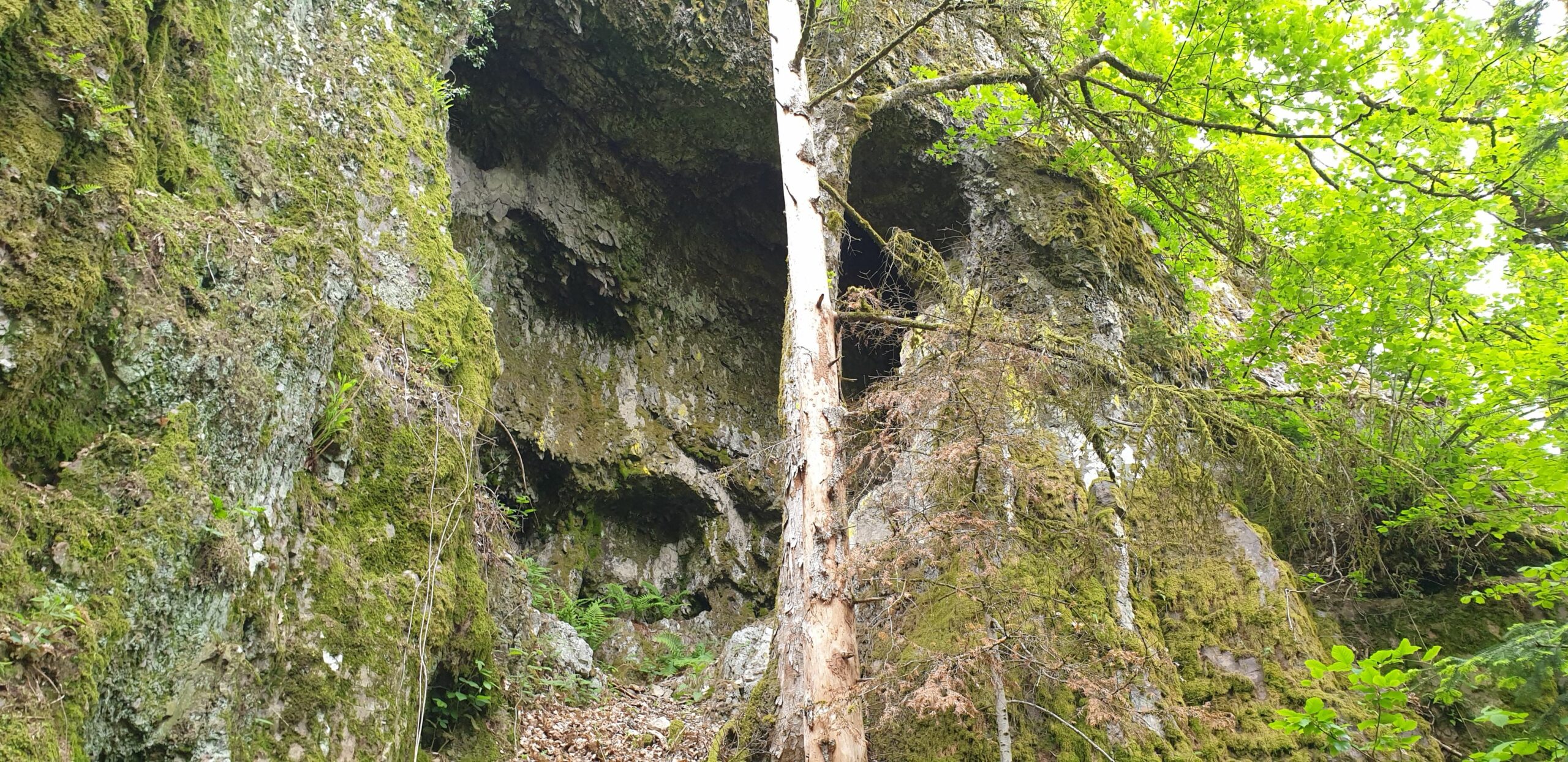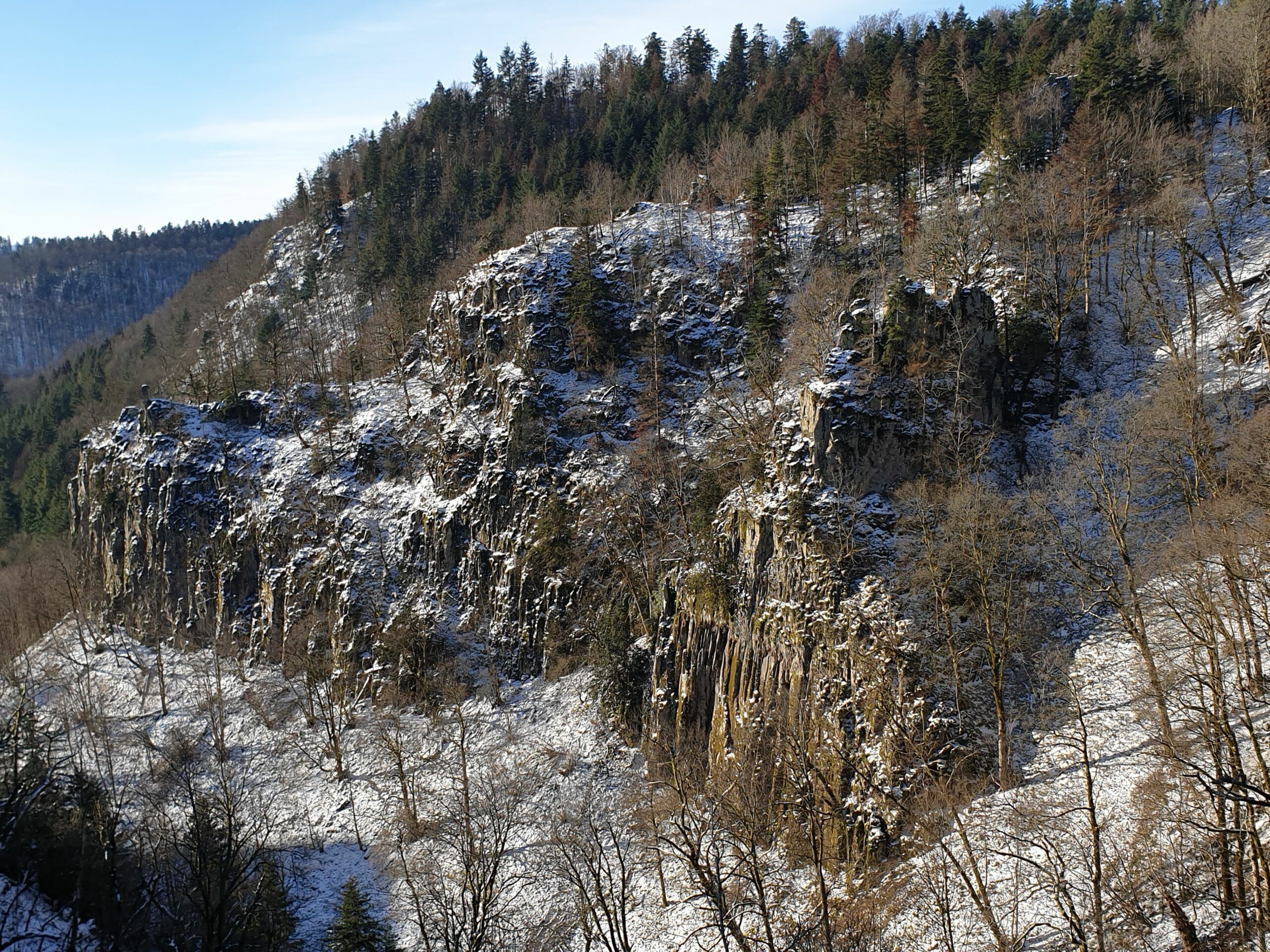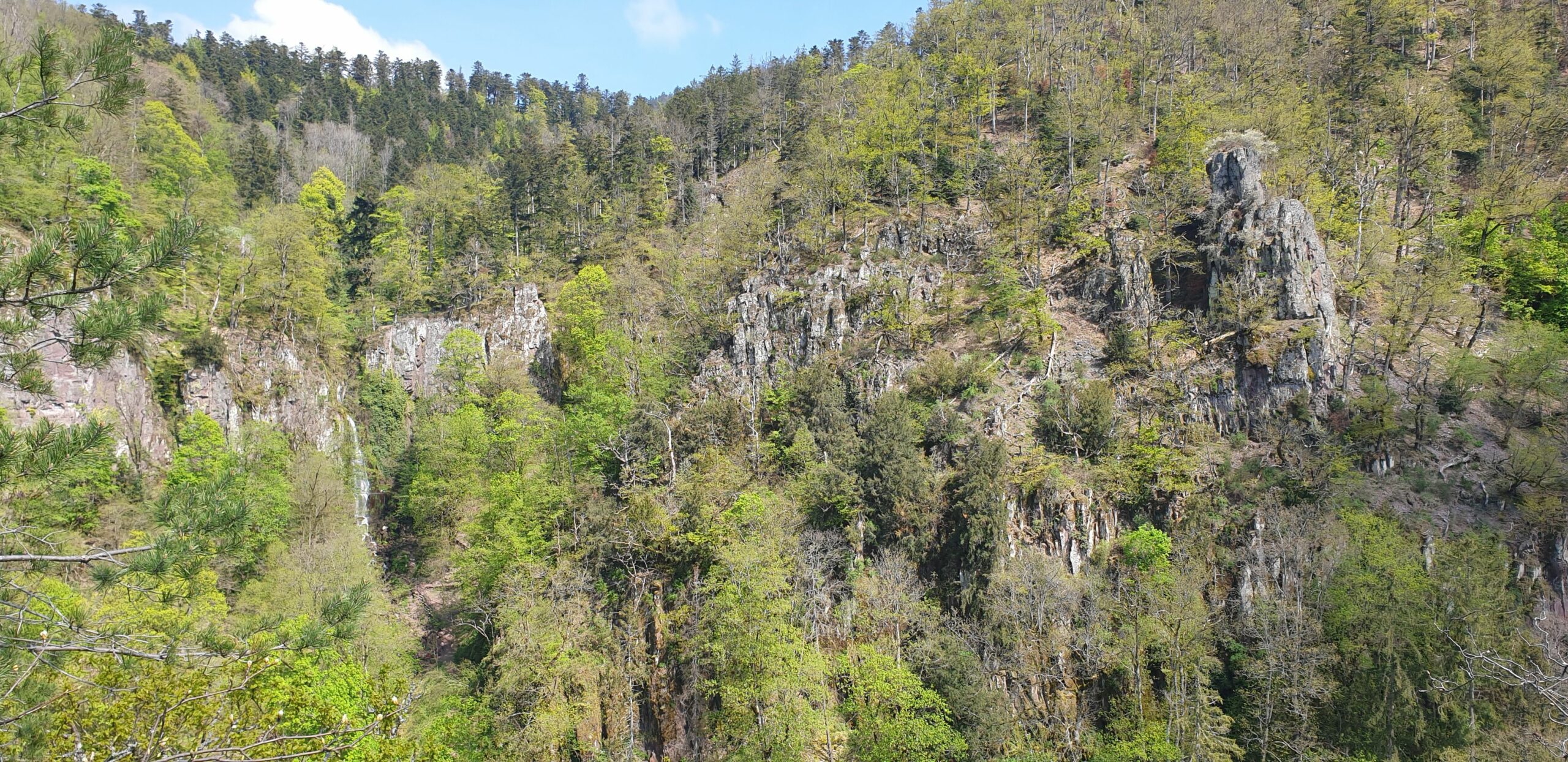 Sous les falaises, se trouvent de vastes éboulis d’origine volcanique, qui atteignent le ruisseau du Nideckthal. La pente forte et l’instabilisté du substrat explique que de nombreux arbres tombent régulièrement dans le lit du ruisseau