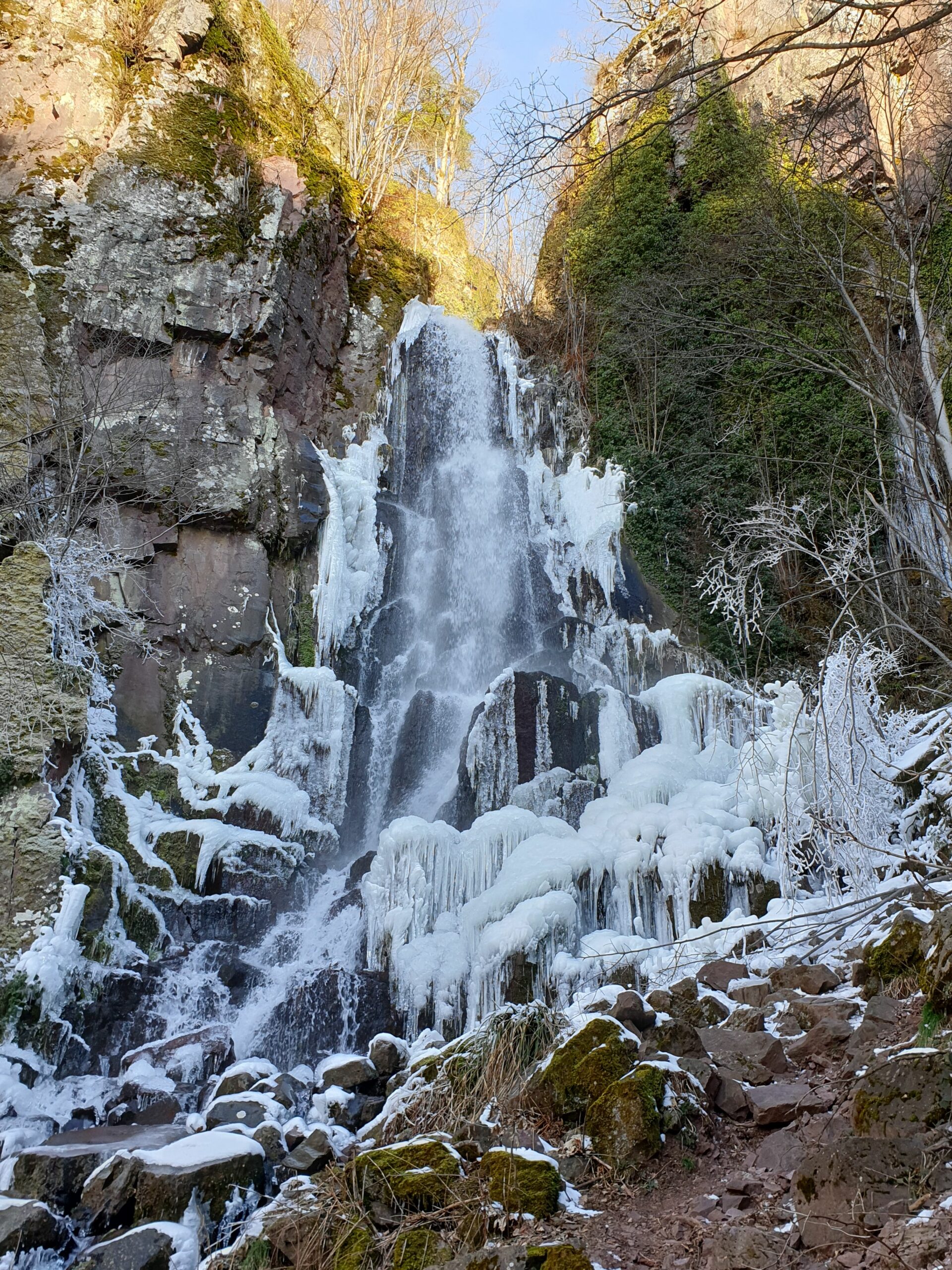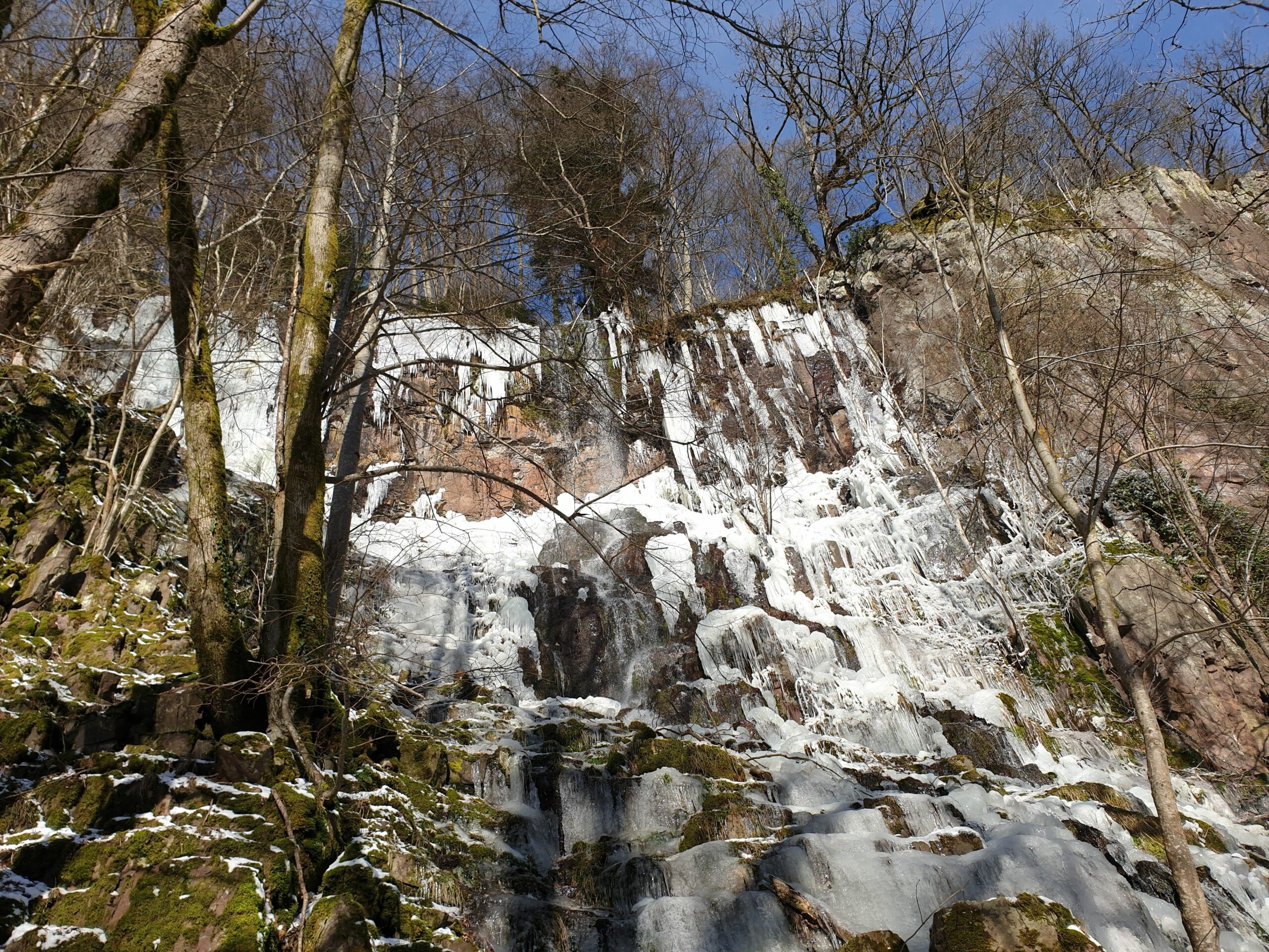 La cascade, qui fait 25m, est en effet spectaculaire. Elle l’est encore davantage quand elle gèle quelquefois lors d’hivers très froids (photo du centre). Mais ce qu’on connait moins est la deuxième cascade, plus discrète car loin du sentier. Mais l’hiver, lorsque l’eau est abondante et qu’il gèle, cette deuxième cascade devient très visible dans le paysage (photo de droite).