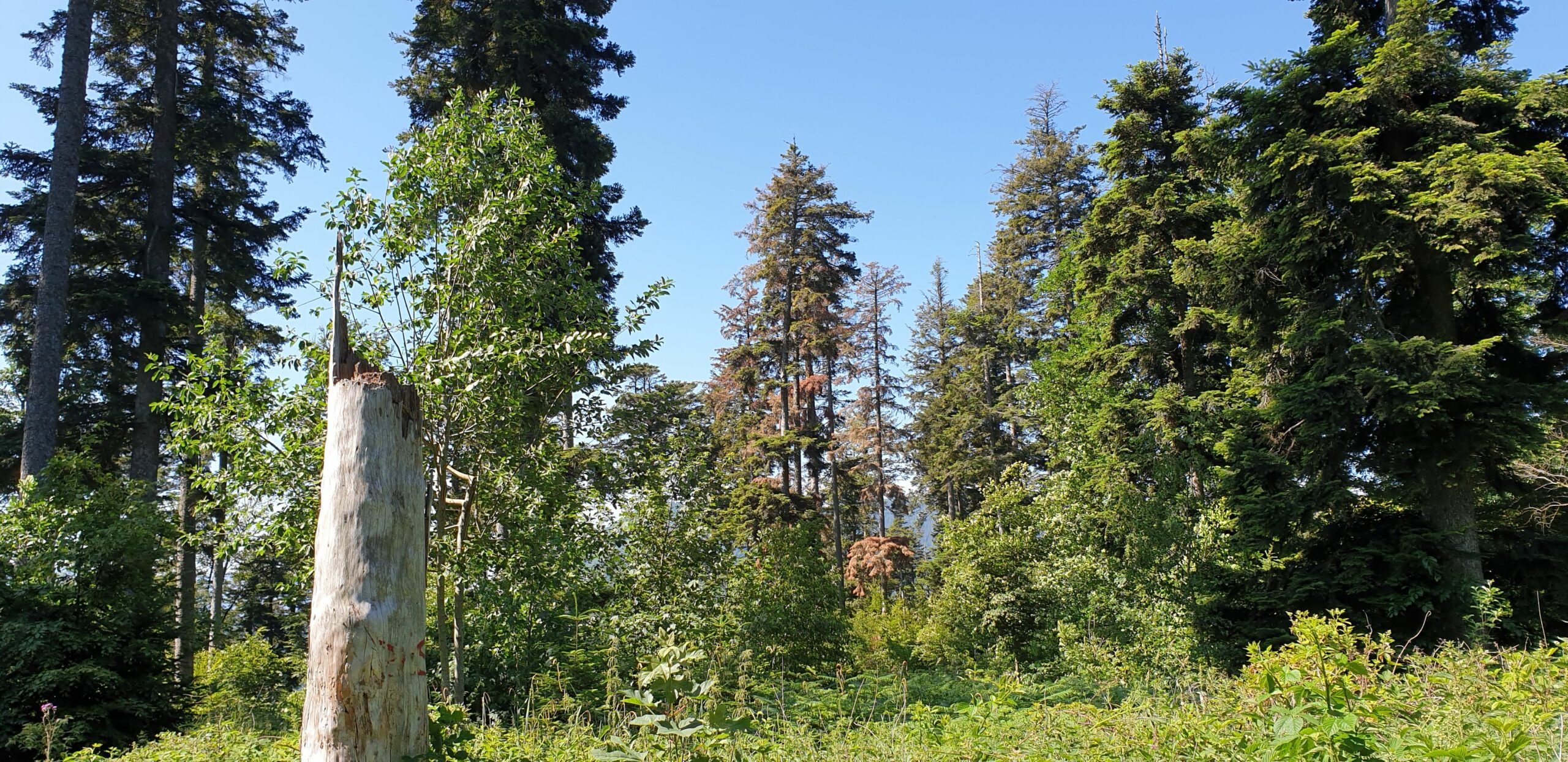 Actuellement, les conifères (sapin et épicéa) ont du mal à survivre dans certaines parties du vallon, en raison des canicules de plus en plus fréquentes liées au changement climatique. Les anciennes coupes y sont aussi pour quelque chose: la forêt précédente était plus dense et plus stable, et résistait mieux aux stress hydriques.