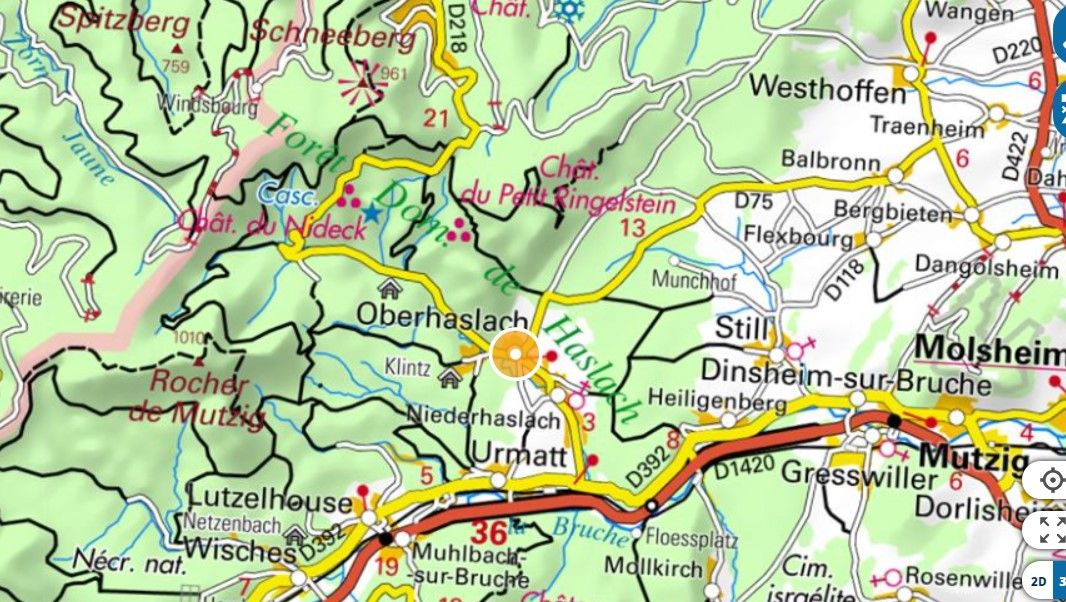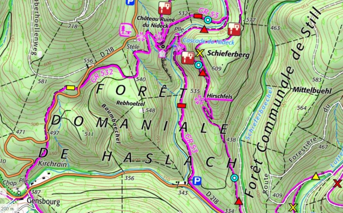 La beauté du site du Nideck, dans les Vosges moyennes, incite de nombreux visiteurs à parcourir le vallon du Nideckthal, qui mène à une belle cascade et à un château médiéval. Pour y accéder, il faut quiter la vallée de la Bruche en amont d’Umatt et s’engager dans la vallée de la Hasel. Le site même du Nideck se trouve dans un vallon adjacent où coule un ruisseau. Au nord de la carte du milieu, est cité un chateau médiéval ruiné, dont il existe une légende avec un bon géant et sa fille. Sous ce chateau, se trouve une cascade qui fait une des curiosités de ce lieu hautement touristique (cf panneau présent à l’entrée de la vallée)