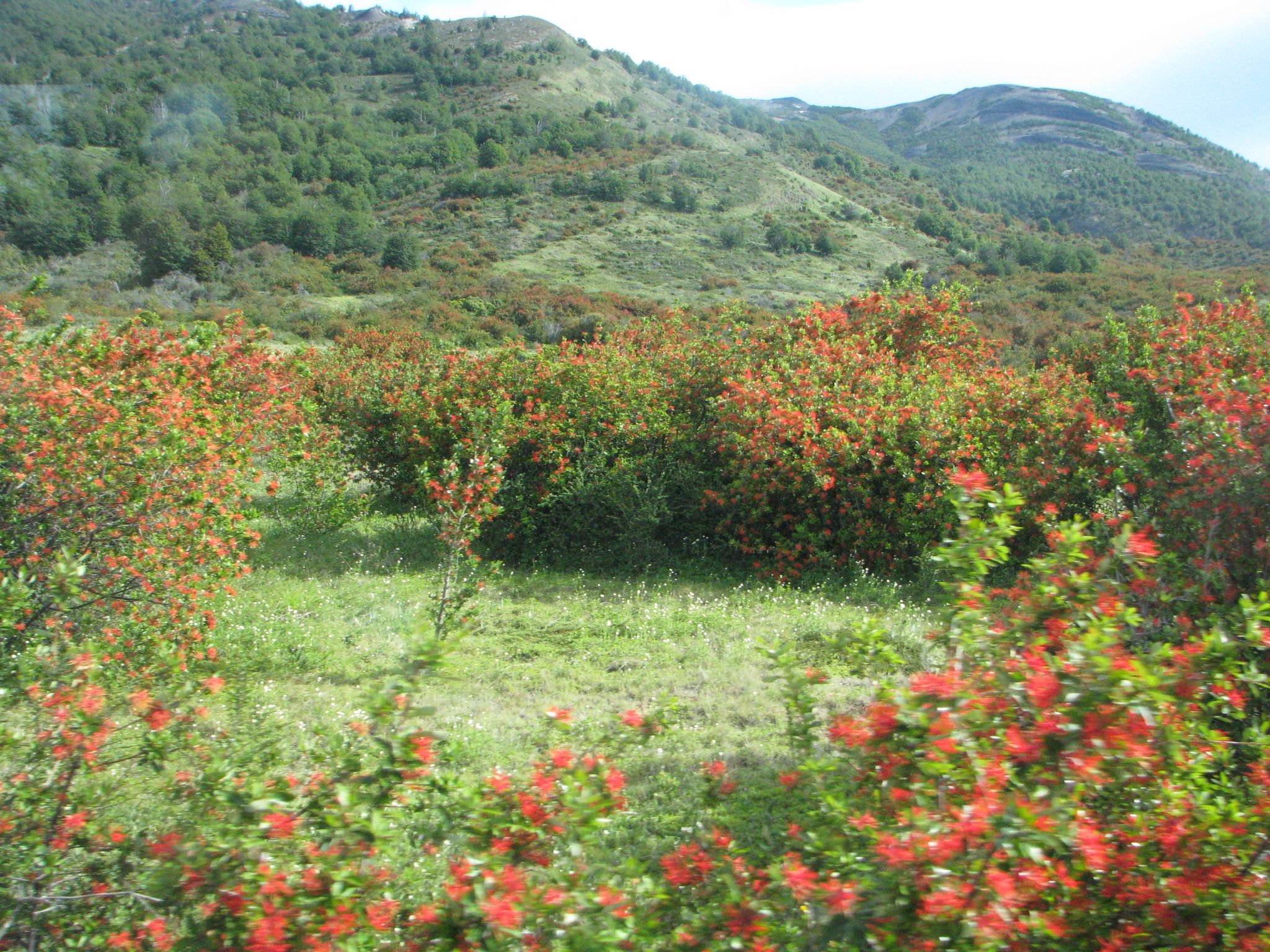 En bordure du glacier et du lac, dans les endroits défrichés, se développe le « firebush » (buisson de feu, Embothrium coccineum), une Protéacée, qui flamboie au cours de ce printemps.